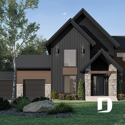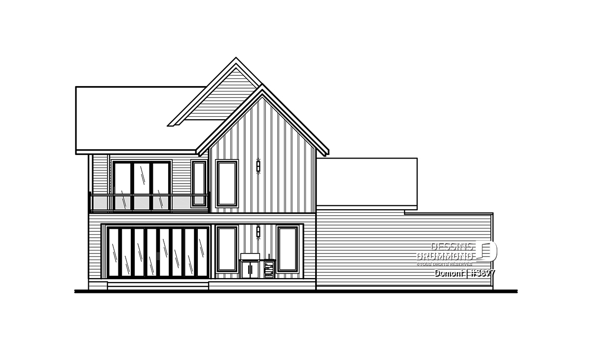 Vue avant - MODÈLE DE BASE - Plan de maison 3 à 6 chambres, grande suite des maîtres avec balcon privé, bureau, garde-manger, 2 foyers - Dumont