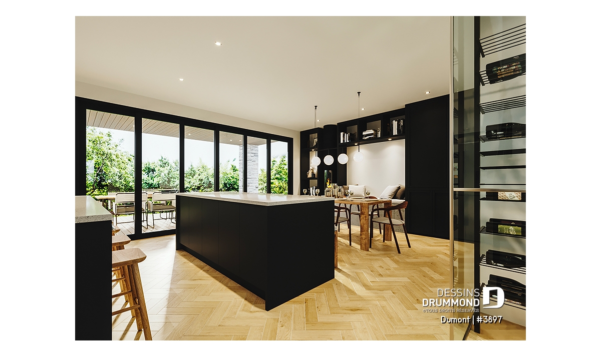 La cuisine est bien aménagée avec un cellier, une grande arrière cuisine (grand garde-manger), 2 îlots, et elle est ouverte sur la salle à manger. Cette dernière a une banquette adossée au deuxième îlot en guise de sièges d'un côté de la table. De plus, un poêle à bois vient donner une belle ambiance à ce secteur lors de soirée entre amis ou famille. À noter que cette portion de la maison, soit la salle à manger et la cuisine, reçoit beaucoup de lumière naturelle via des portes rétractables. Ce type de porte permet de joindre la vie intérieure et extérieure pendant les belles journées de l'été! De plus, un pratique vestiaire vous permet d'accéder du garage vers le garde-manger afin d'y déposes vos sacs d'épicerie!