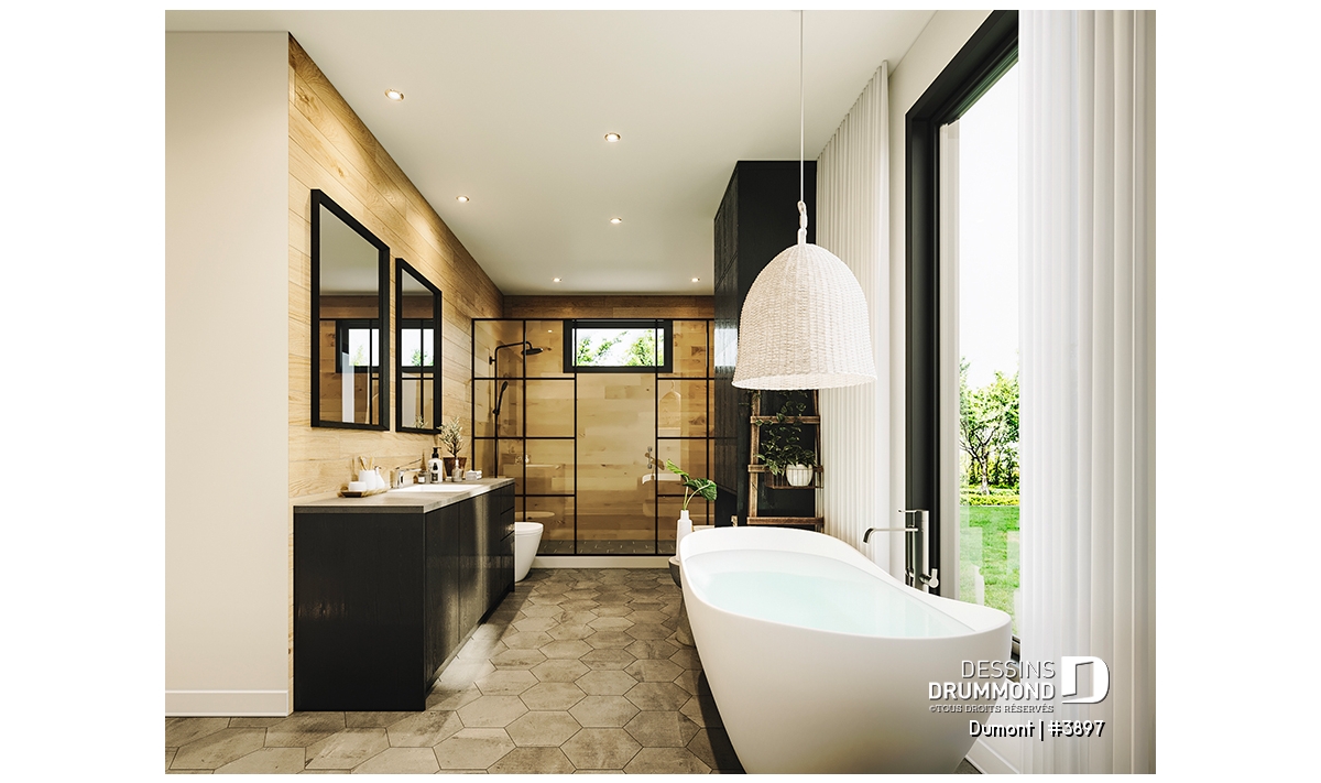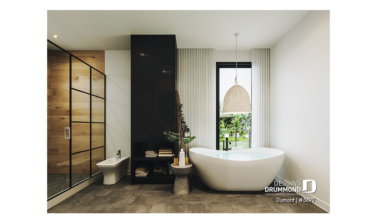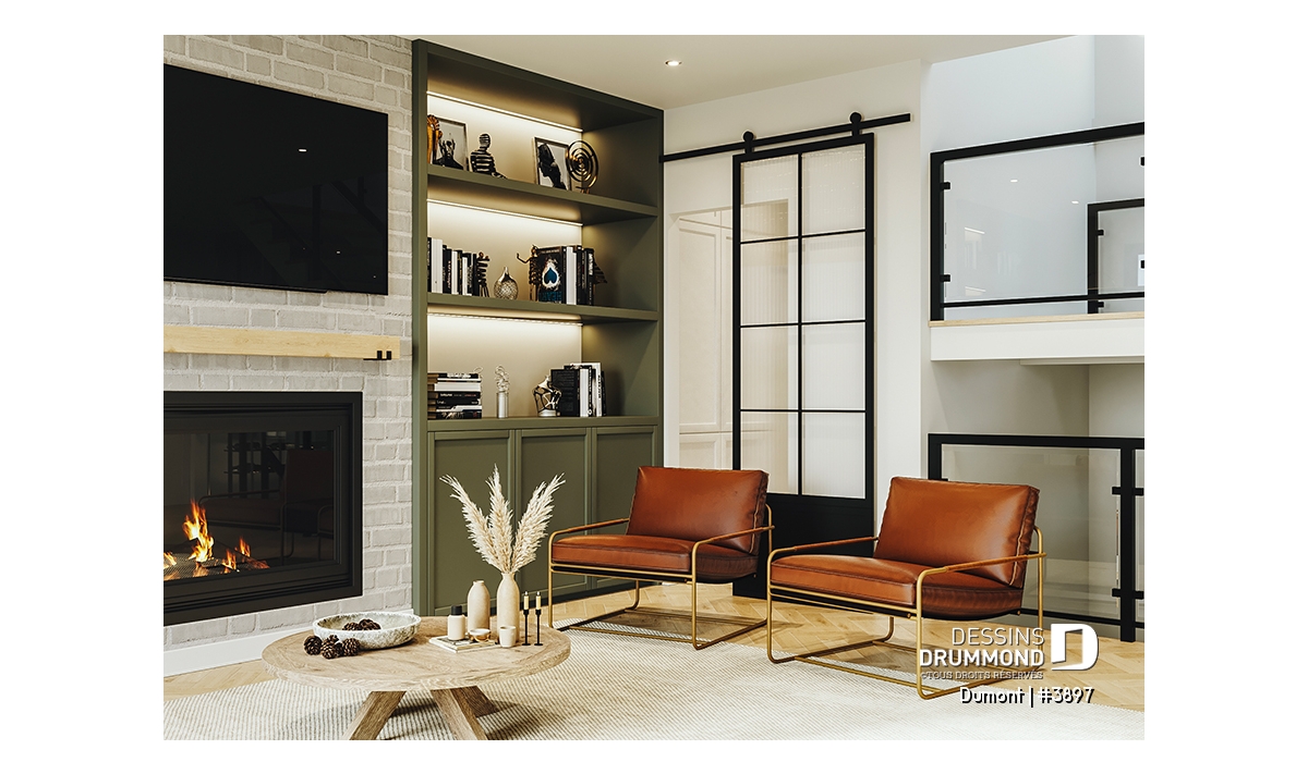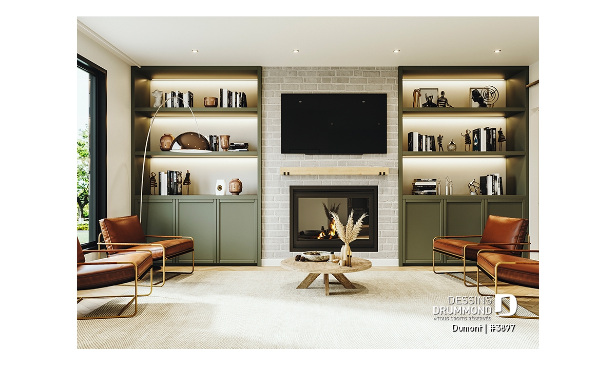 Le plan de maison DUMONT (#3897) propose 4270 pi.ca. aménagés sur 3 étages, en plus d'un garage double, d'une terrasse abritée au rez-de-chaussée et d'une terrasse abritée partiellement à l'étage. De plus le sous-sol est fini, mais non inclus dans nos coûts de construction. Les plafonds sont à 9 pieds de hauteur au rez-de-chaussée et à l'étage.