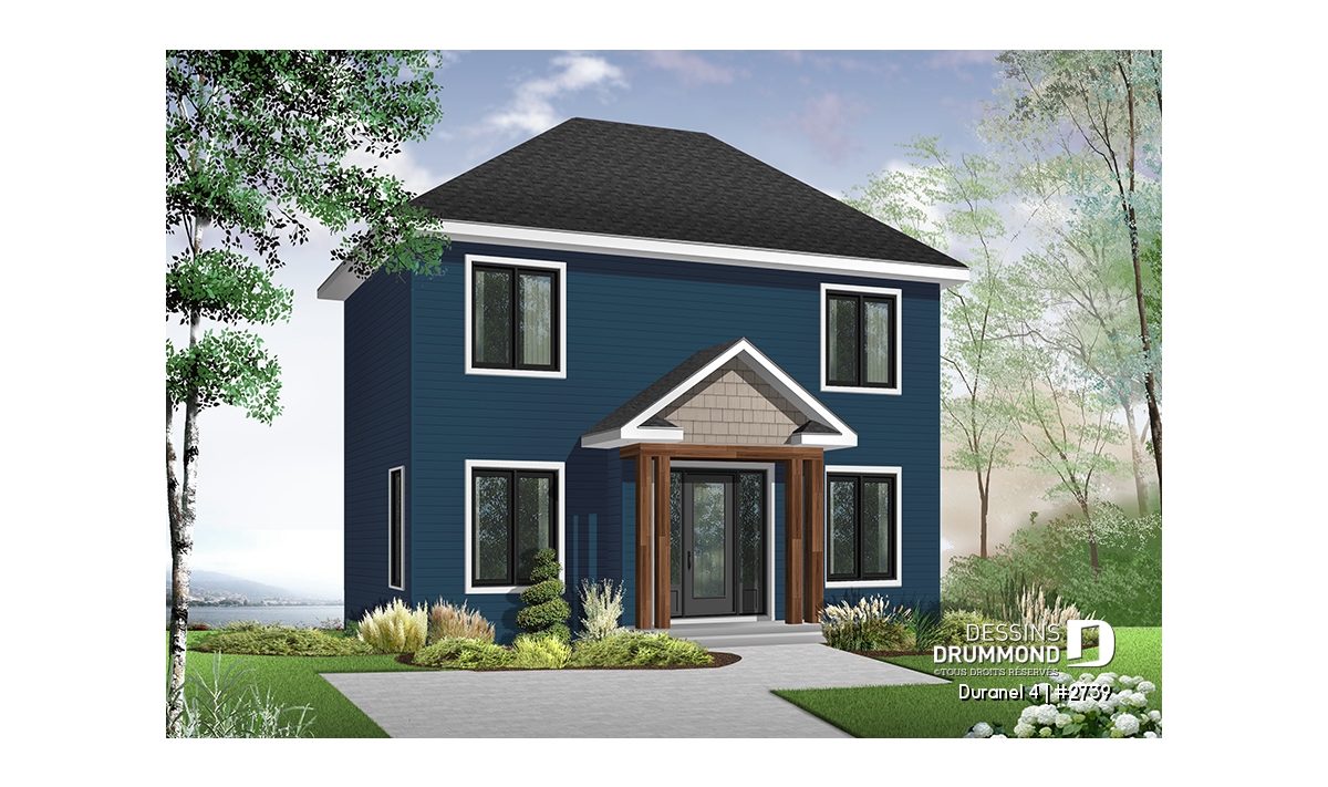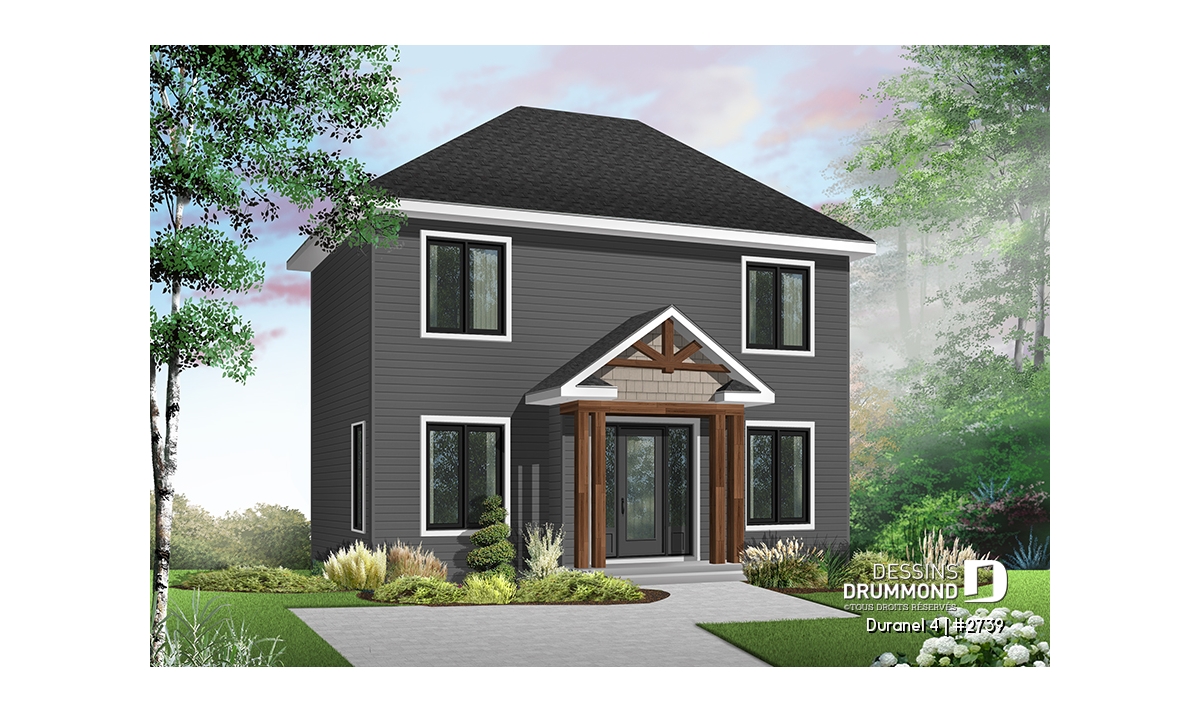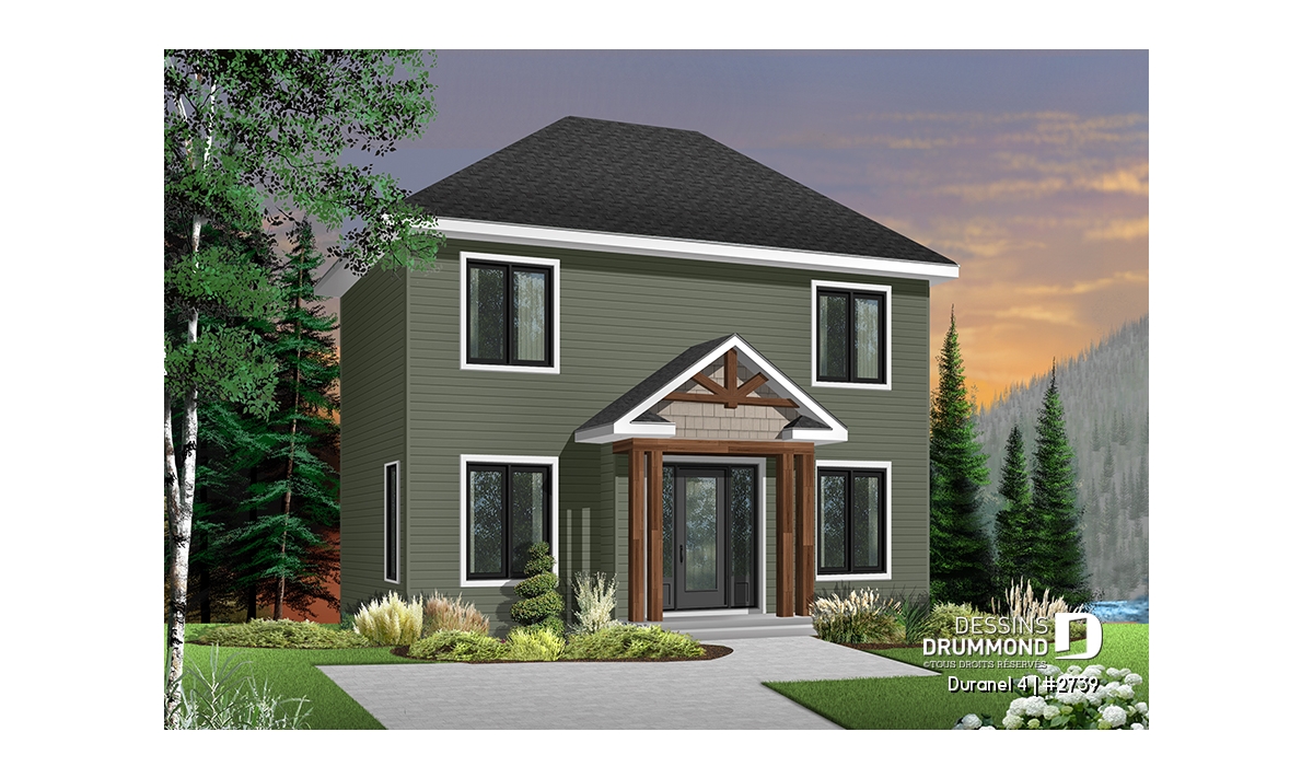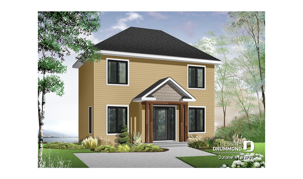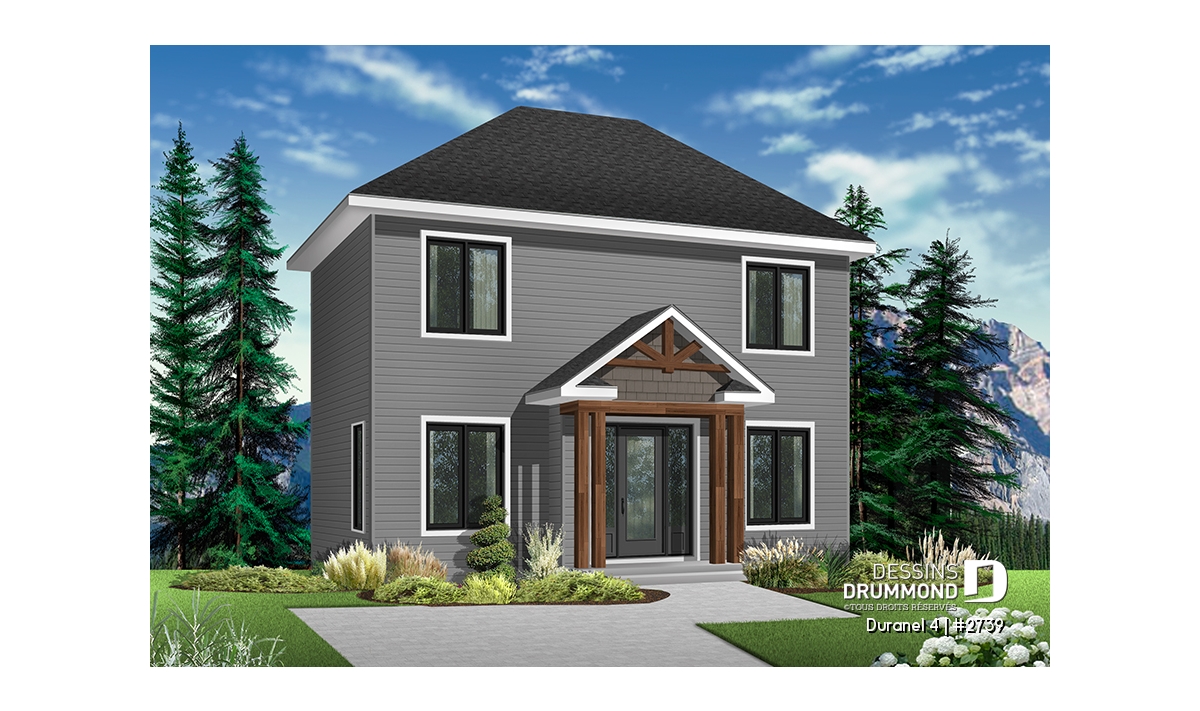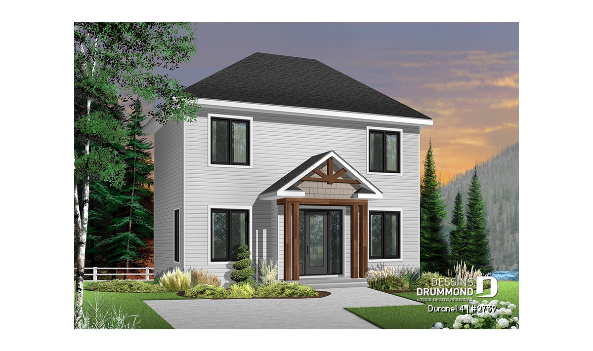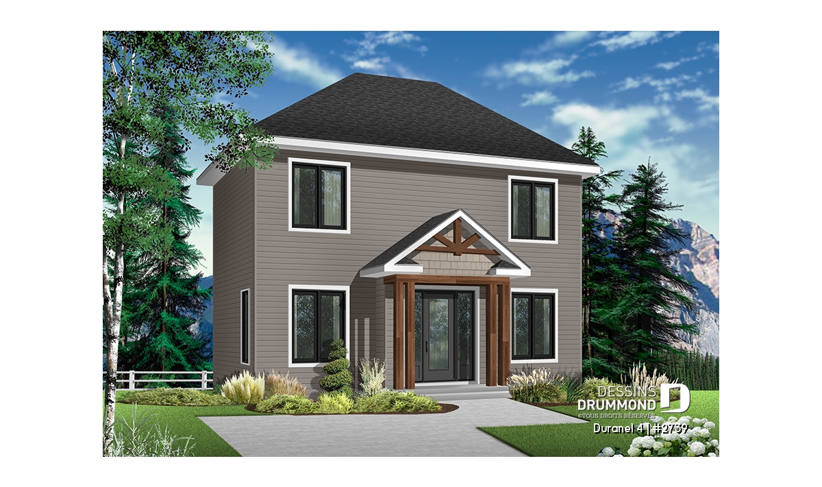 Vue avant - MODÈLE DE BASE - Plan de maison transitionnelle, cuisine avec comptoir-lunch, buanderie au r-d-c, 3 chambres, économique  - Duranel 4