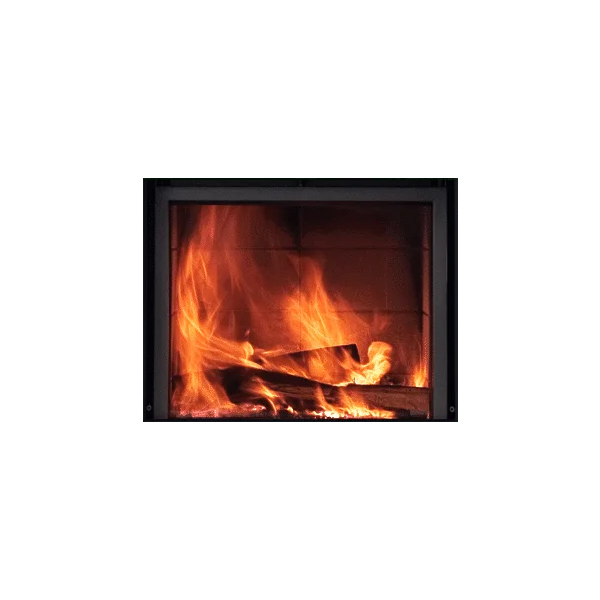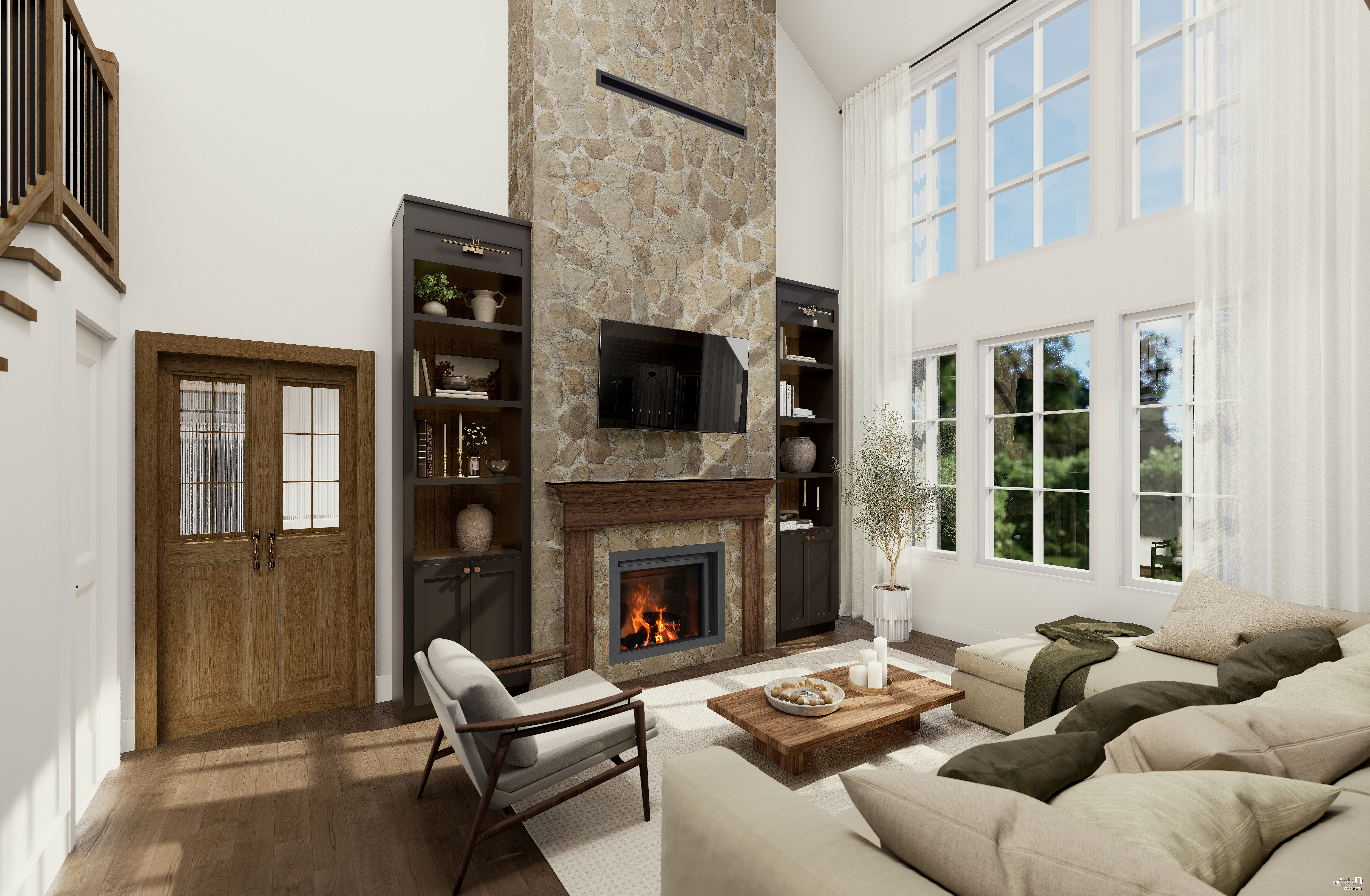 La cuisine s’ouvre sur un salon majestueux au plafond de 18'4", apportant une impressionnante sensation de grandeur. Au cœur de cet espace trône un foyer central, véritable signature du plan. Le modèle proposé, le foyer à bois STÛV s21, combine performance et design élégant. Il devient le point focal du séjour en apportant chaleur, ambiance scandinave et charme intemporel aux soirées en famille ou entre amis. De grandes fenêtres donnant sur la cour arrière baignent la pièce de lumière naturelle et renforcent cette atmosphère conviviale.