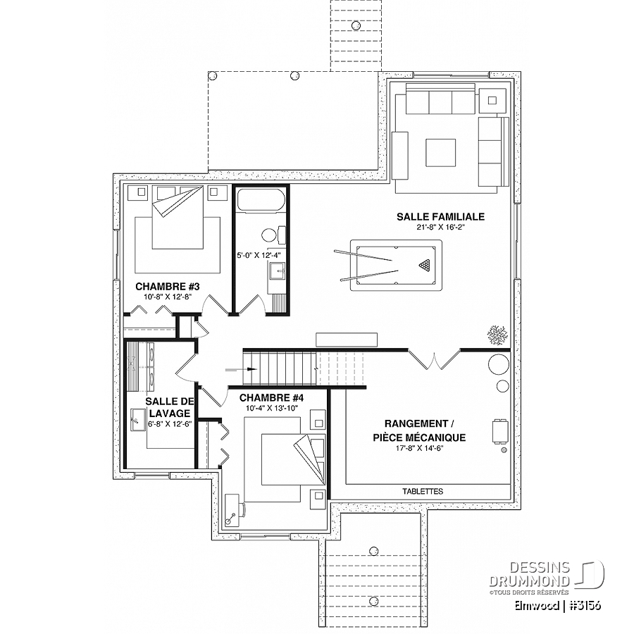 *Si vous souhaitez acheter le plan du sous-sol aménagé, tel que présenté sur la page de ce plan, veuillez sélectionner cette option dans le panier d'achat, dans la section "Sélectionner votre fondation". Si vous ne sélectionnez pas cette option, vous recevrez le sous-sol non fini, sans frais additionnel.