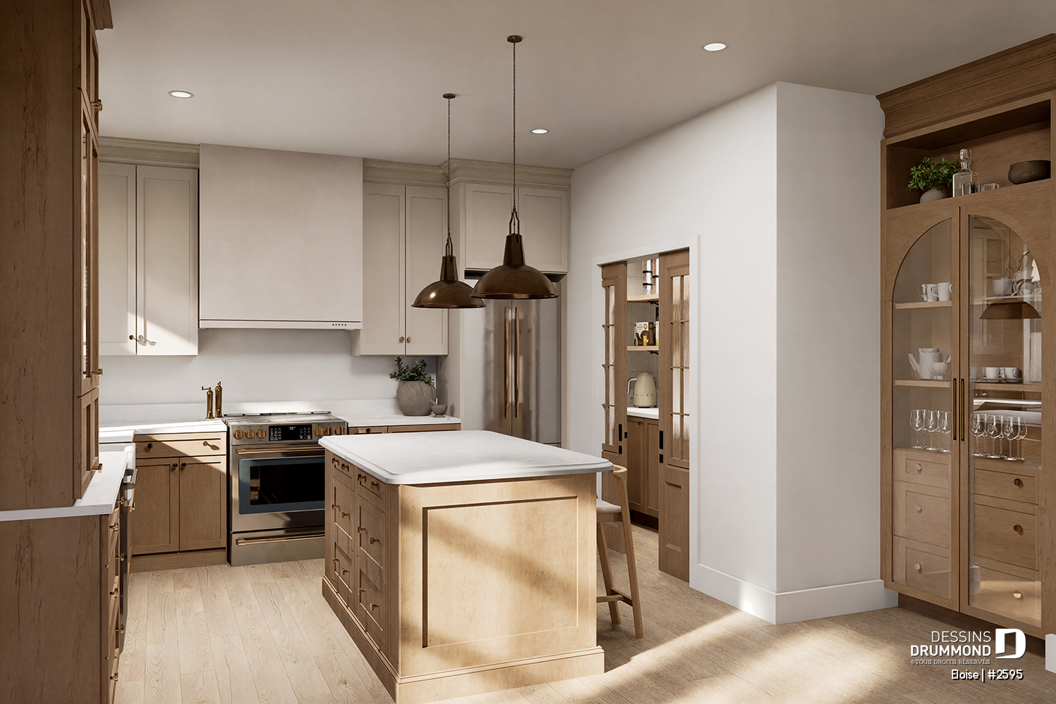 Cuisine fonctionnelle avec îlot central et garde-manger intégré.