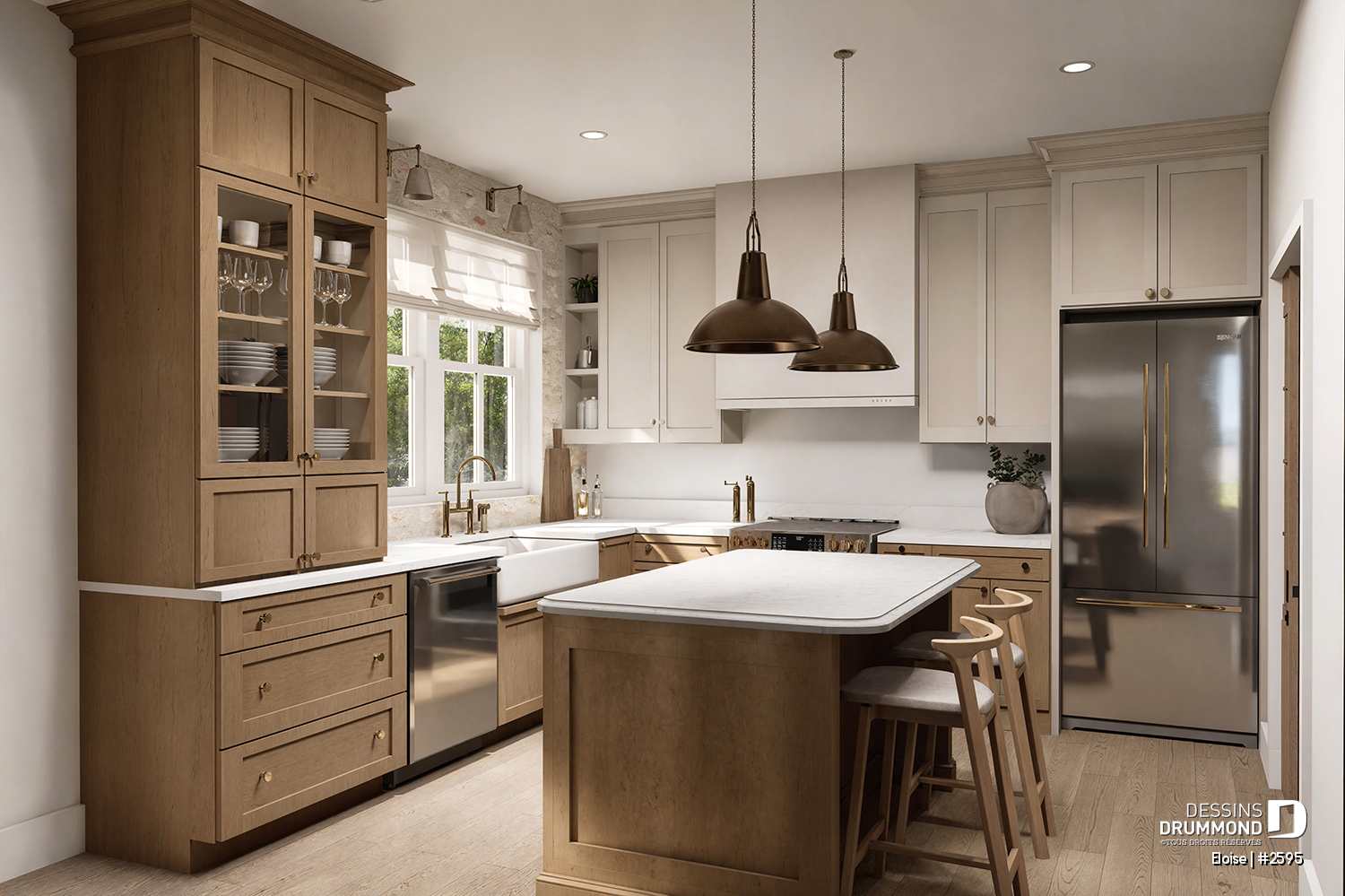 Maison campagne française à étage avec foyer central, îlot de cuisine et galerie abritée