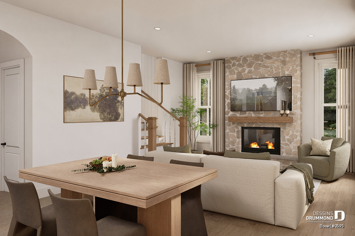 Salon chaleureux avec foyer central, visible à la fois de la cuisine et de la salle à manger.