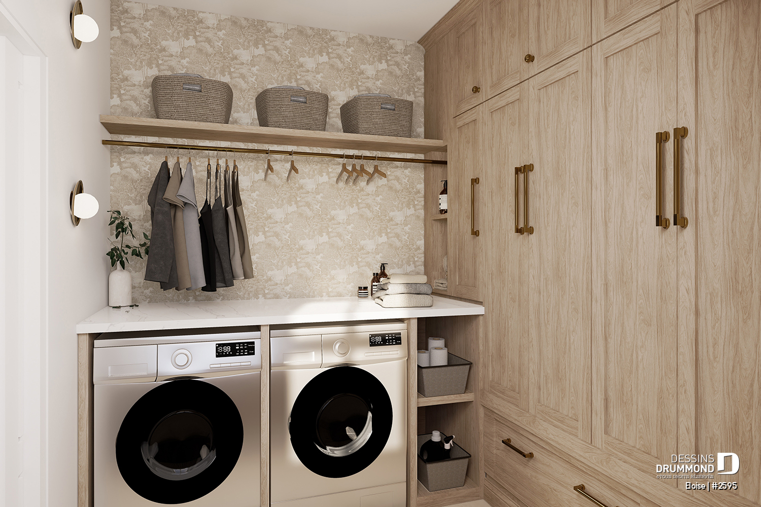 Combinaison pratique salle de lavage et garde-robe d’entrée, avec chute à linge intégrée.