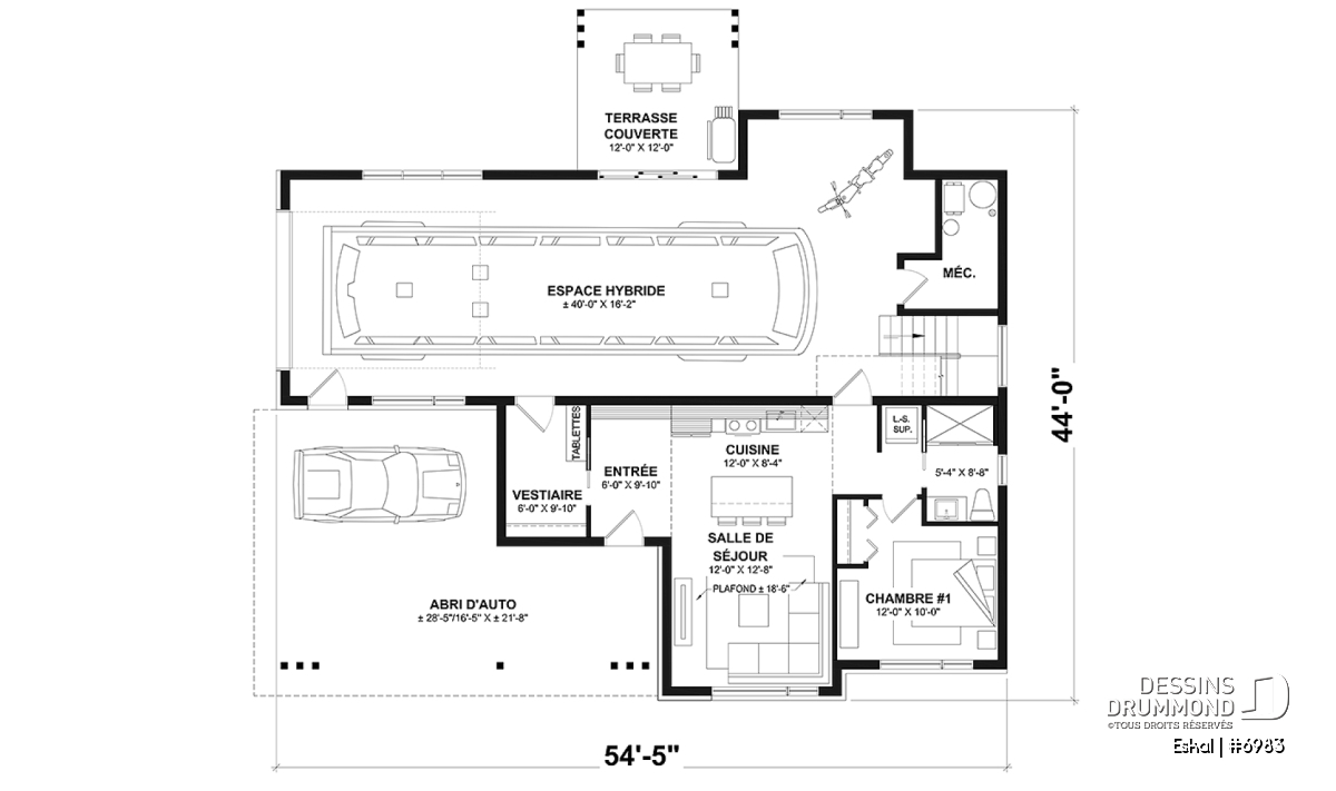 Le plancher de base, proposant une seule chambre, sera idéal pour personne(s) possédant un motorisé, ou VR, de Classe A, B ou C. Cette version propose un garage pour VR de 40' x 16'2'', avec coin pour motocyclette ou vélo(s) et salle mécanique.