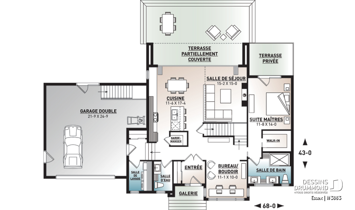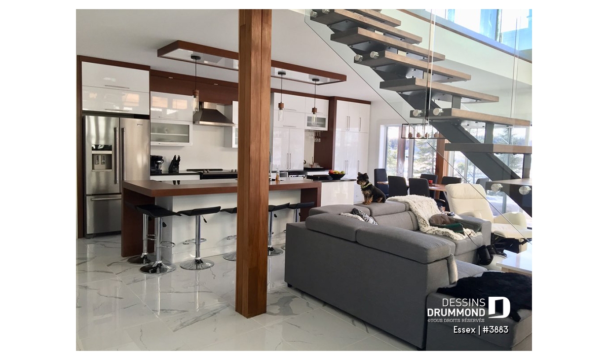 Bureau / Salle étude, Salle de lavage au rez-de-chaussée, Ilôt, Foyer, Garde-manger, Mezzanine, Plafond à plus de 8', Suite des maîtres à l'étage, Terrasse abritée, Accès au sous-sol du garage, Aire ouverte, Walk-in ch. maîtres, Vestibule, Bain et douche séparés, Lavabo double