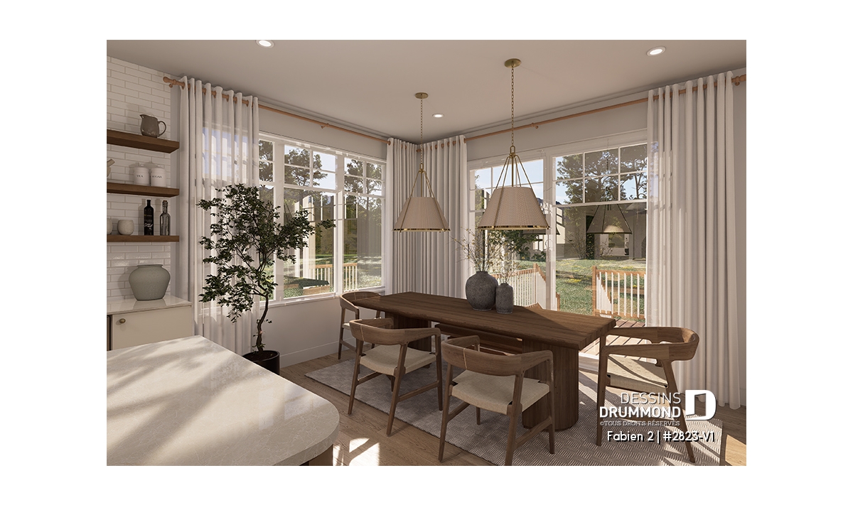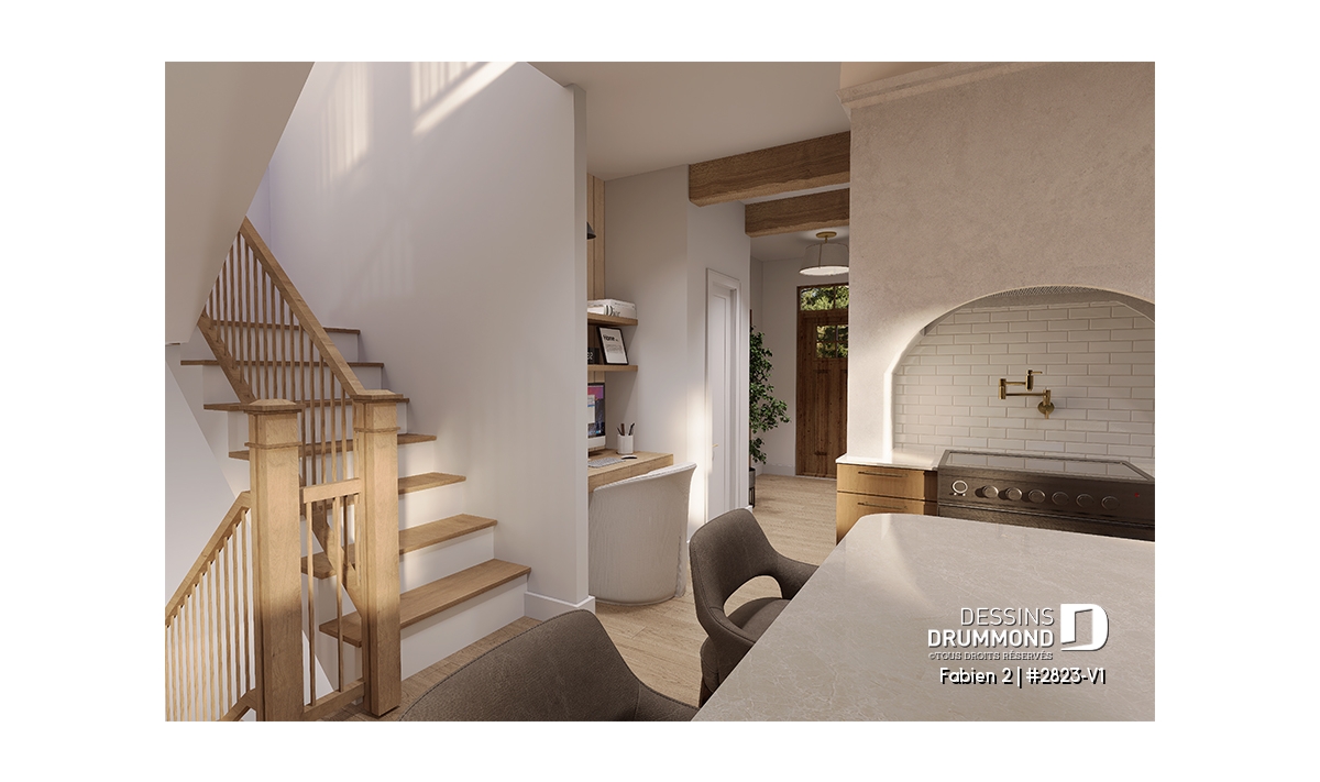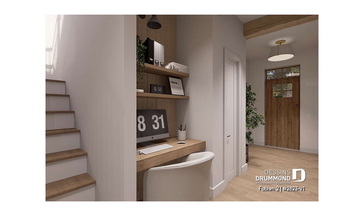 Dès l’entrée, un vestiaire pratique permet de bien organiser manteaux et accessoires, facilitant le quotidien des familles actives. Le plafond de 9 pieds au rez-de-chaussée amplifie la luminosité et procure une agréable sensation d’espace. Près de la cuisine, un petit coin bureau discret se transforme facilement en espace de travail ou de devoirs.