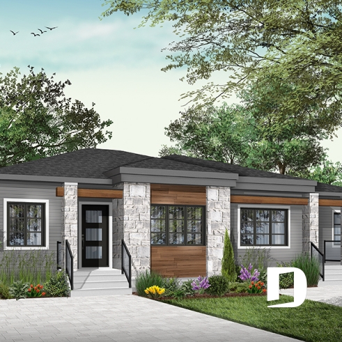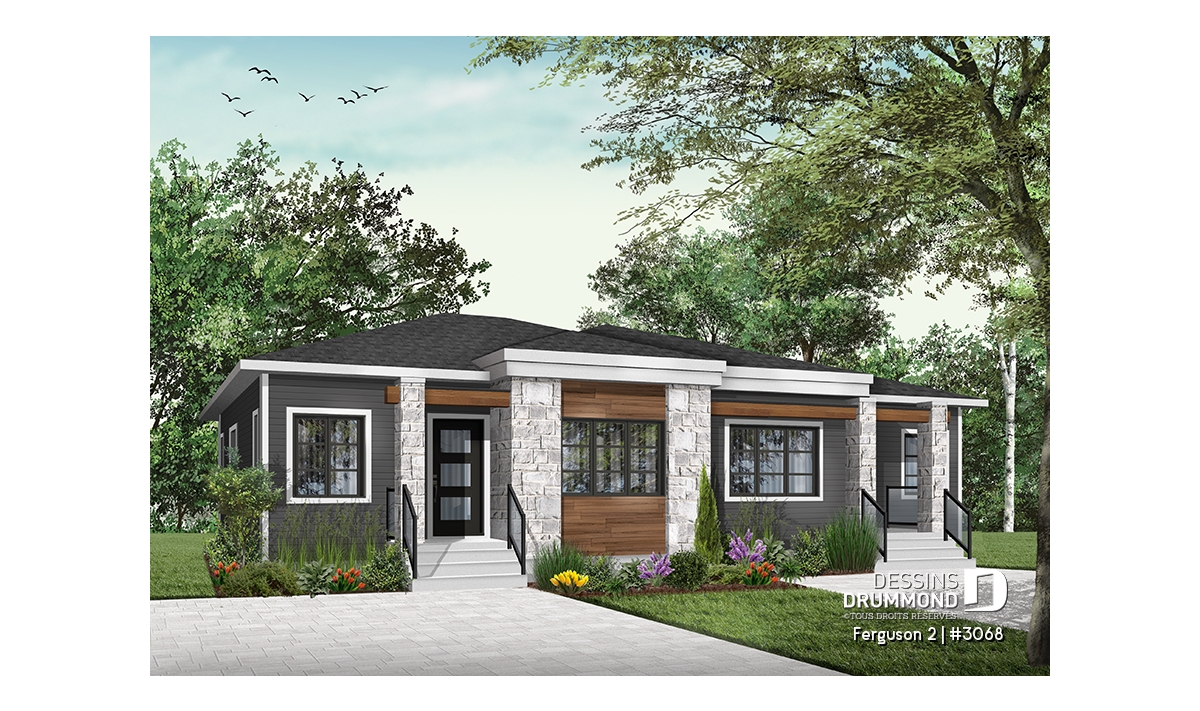 Voici un modèle de jumelé de style contemporain, le nouveau plan # 3068 de Dessins Drummond, vous offrant de beaux espaces et un potentiel au sous-sol pour le futur! Le modèle Ferguson 2, qui est un dérivé du plan # 3067, propose un sous-sol à aménager et une seule salle de bain au rez-de-chaussée au lieu de deux comme son modèle de base. Cette version # 3068 du modèle de base a été pensée pour un couple ou famille souhaitant utiliser l’espace du sous-sol afin d’ajouter des chambres ou une salle familiale. Il est à noter que le plafond du rez-de-chaussée est à 9 pieds partout, ce qui donne une amplitude non négligeable aux pièces.