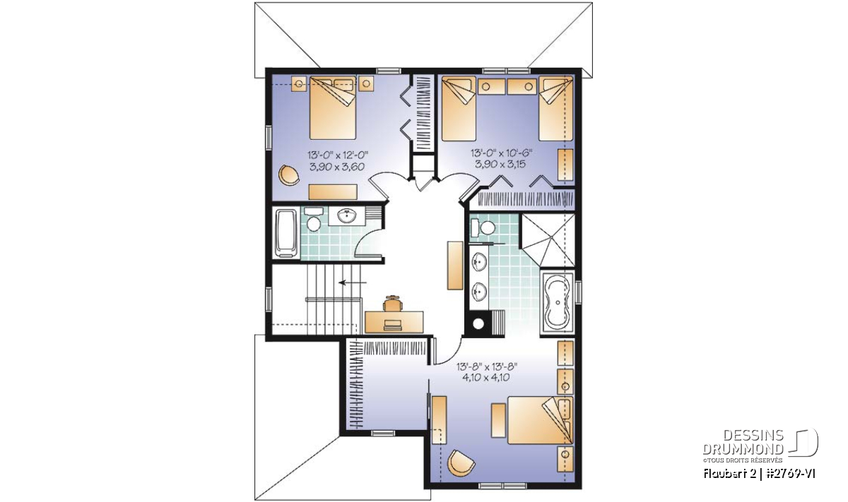 Étage - Plan de maison d'inspiration Tudor, 3 chambres, bureau, 2.5 salle de bain, suite des maîtres à l'étage - Flaubert 2