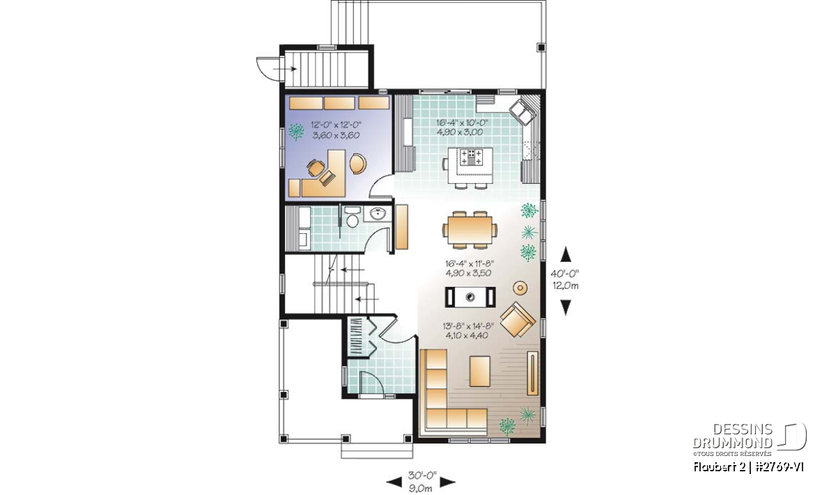 Rez-de-chaussée - Plan de maison d'inspiration Tudor, 3 chambres, bureau, 2.5 salle de bain, suite des maîtres à l'étage - Flaubert 2