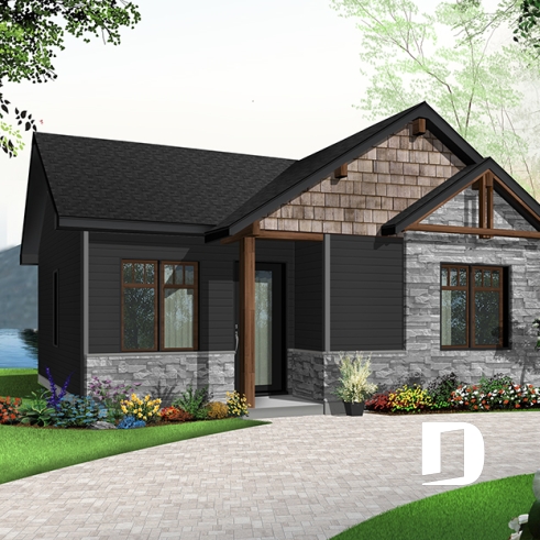 Plan de mini-maison moderne, 2 chambres, construction abordable, buanderie, aire ouverte