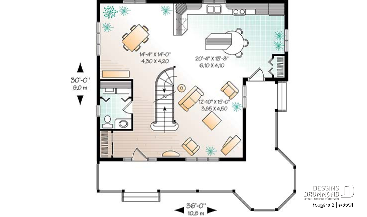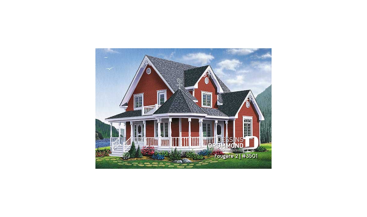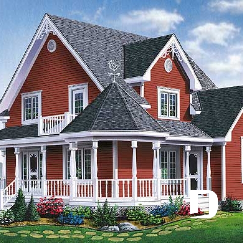 Habillé de déclin champêtre sur l’ensemble de ses façades, de colonnes et barreaux tournés et de quelques moulures aux pignons, ce modèle aux influences loyalistes se prête parfaitement bien à la construction en campagne ou, si vous préférez, sur de grands espaces.