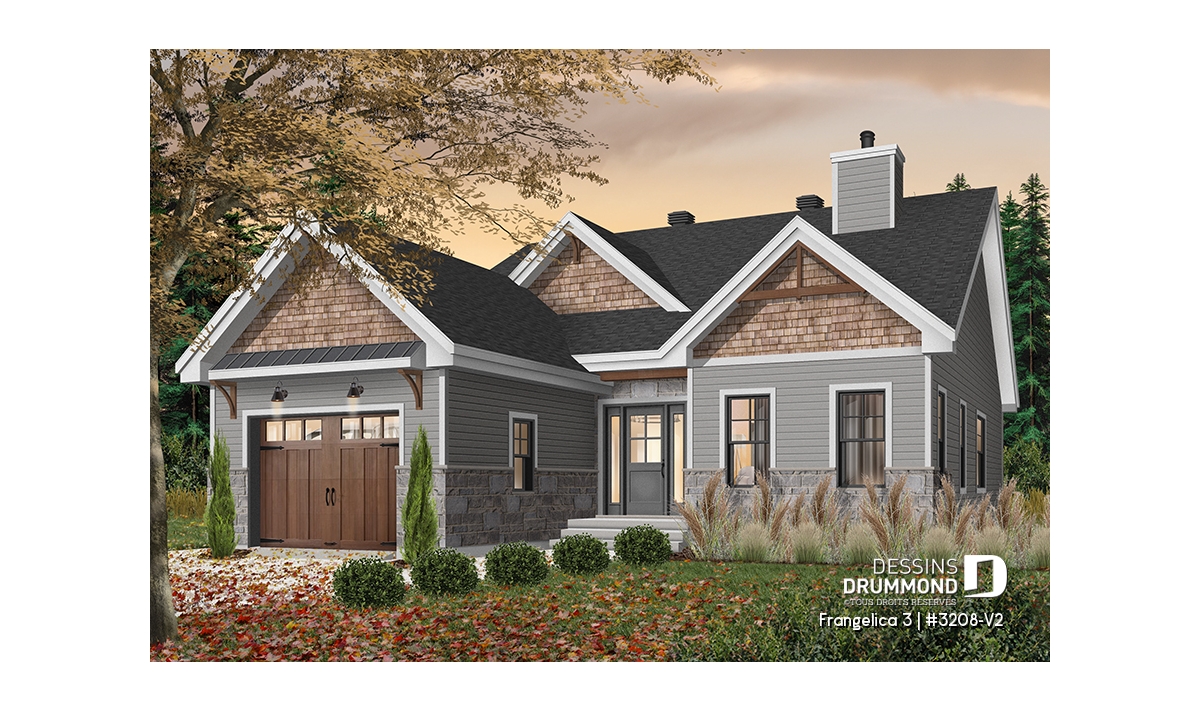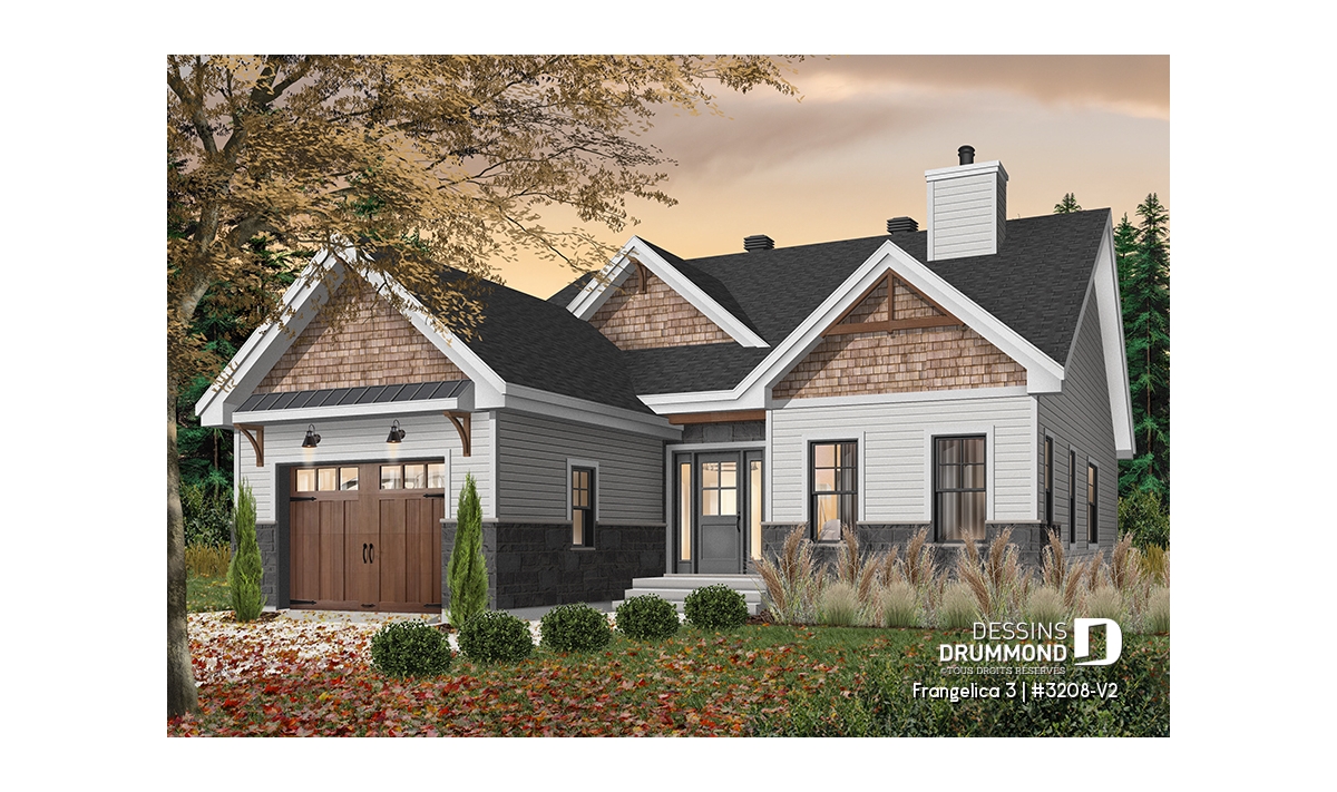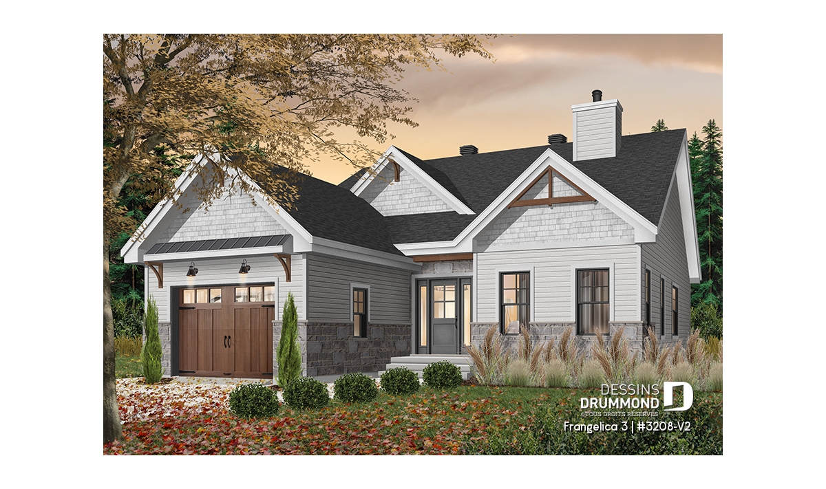 Version couleur no. 1 - Vue avant - Plan de maison 2 chambres, 2 s. bain, suite des maîtres, grand vestiaire, bungalow style farmhouse avec garage - Frangelica 3