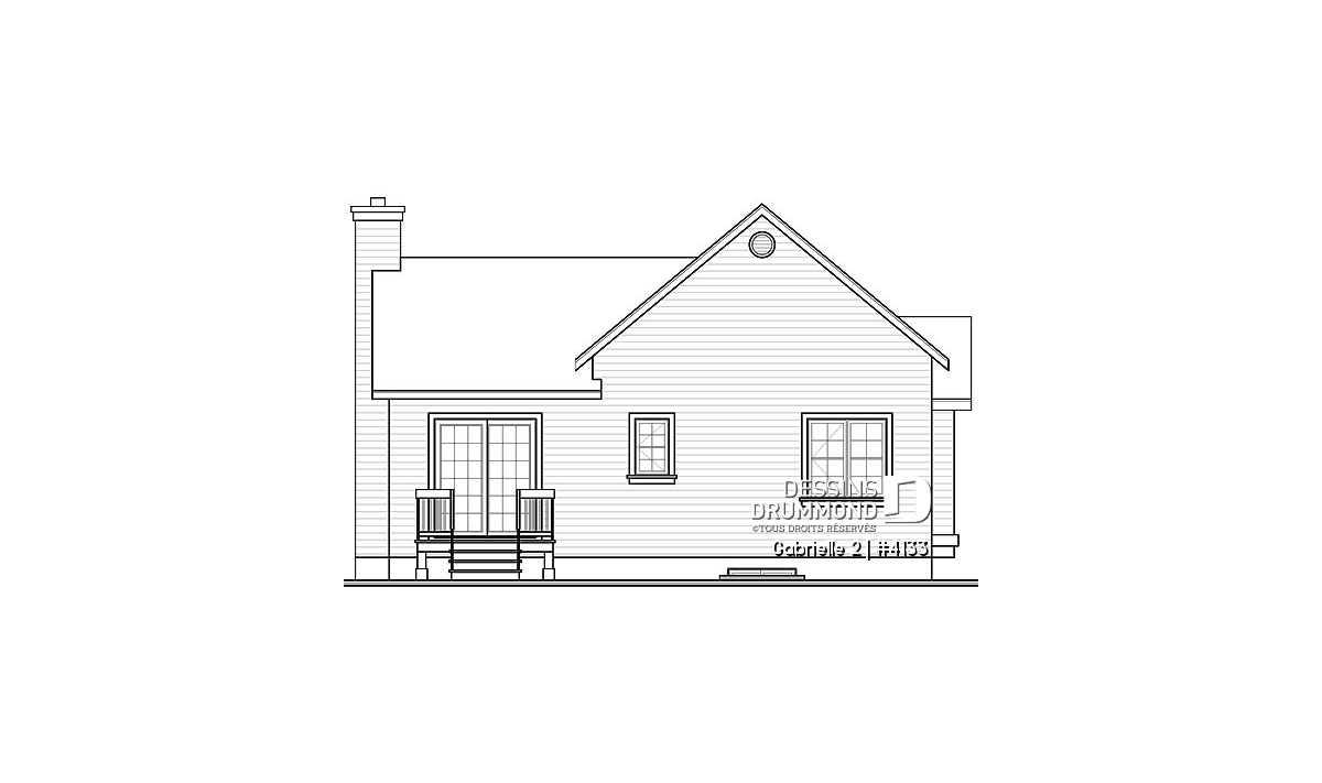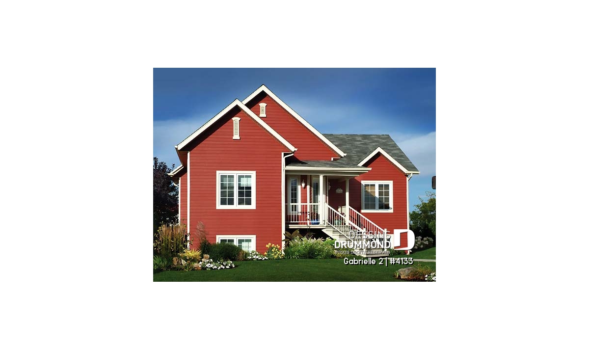 Toujours populaire auprès d’une certaine clientèle désireuse de se distinguer un peu, ce modèle ne passe certes pas inaperçu avec son entrée extérieure à angle, sa fenestration abondante, ses pignons et sa galerie tous deux fort accrocheurs sans oublier cette cheminée bien localisée au faîte du pignon principal pour plus de discrétion et d’harmonie sur la vue latérale.