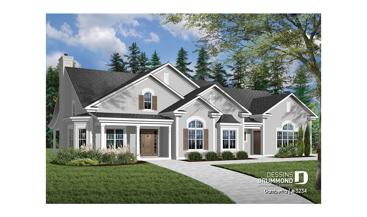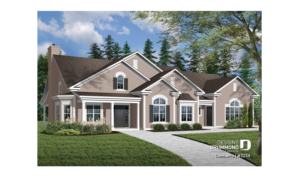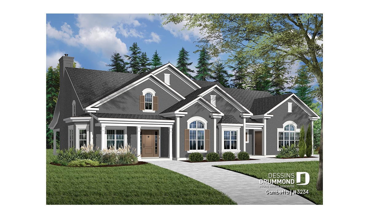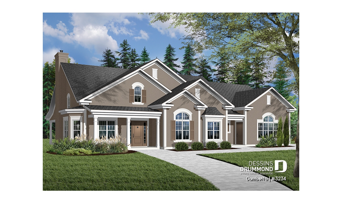 Plan de grand plain-pied avec 3 à 4 chambres et garage double latéral