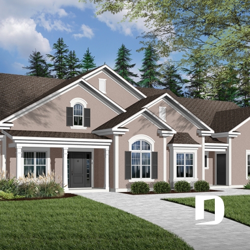 Version couleur no. 1 - Vue avant - Plan de bungalow, terrain en coin, garage double de côté, grande chambre des parents, foyer, cinéma - Gambetta