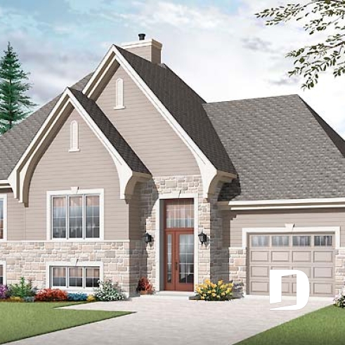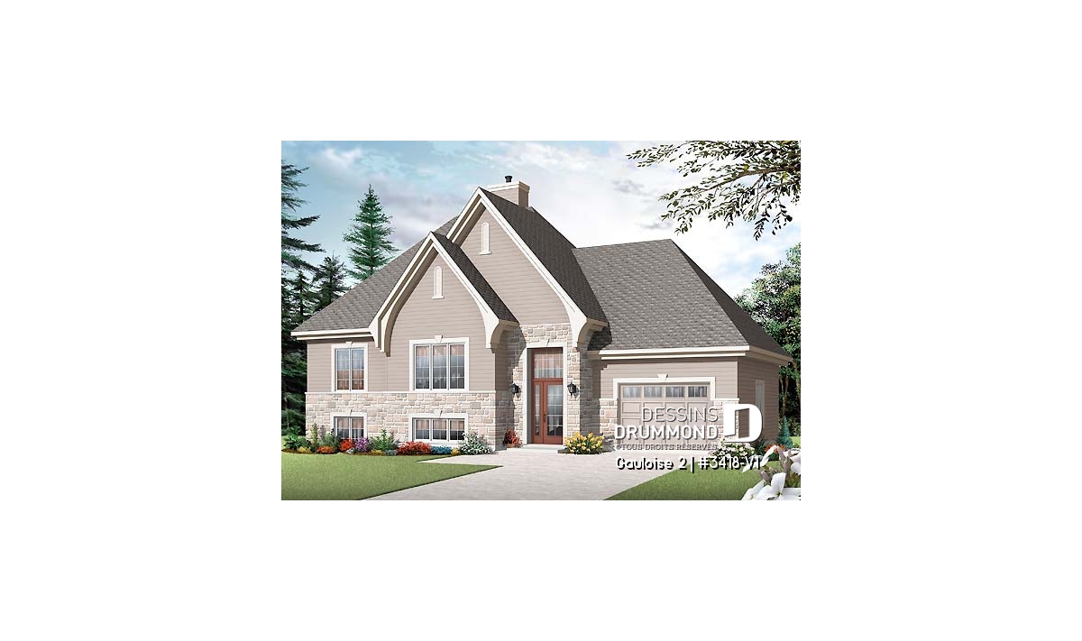 Vue avant - MODÈLE DE BASE - Split-level champêtre, 2 à 4 chambres et 2 salons selon finition du sous-sol, foyer central, garage - Gauloise 2