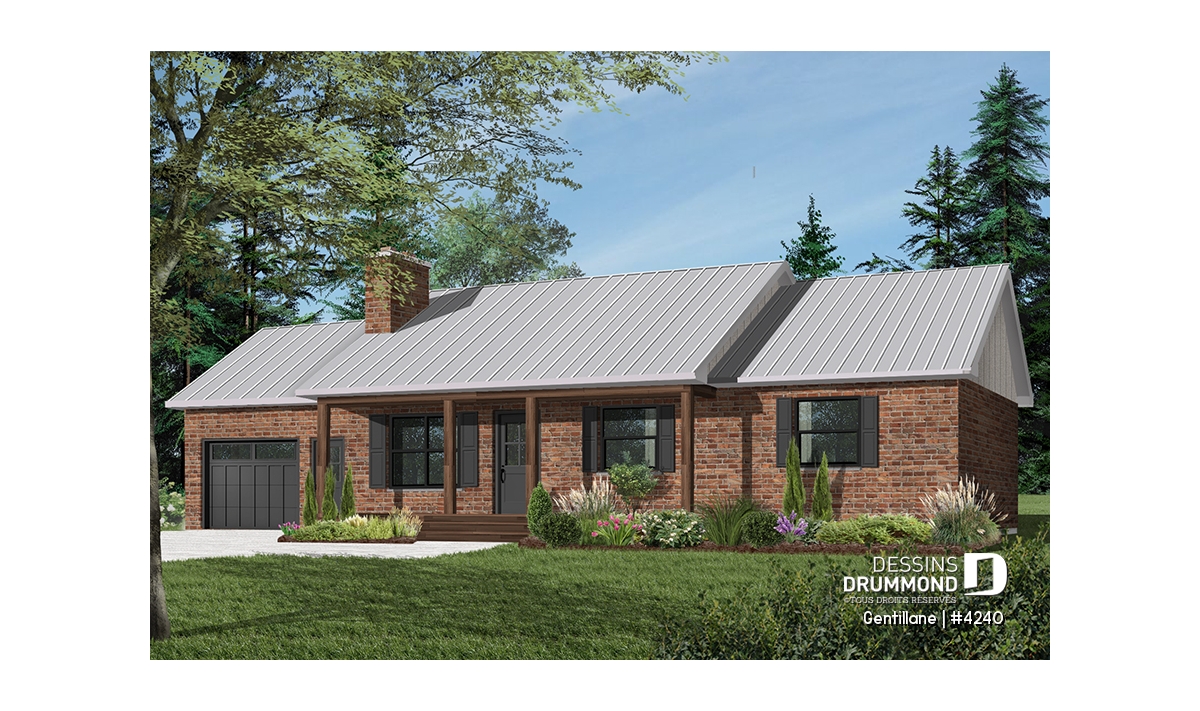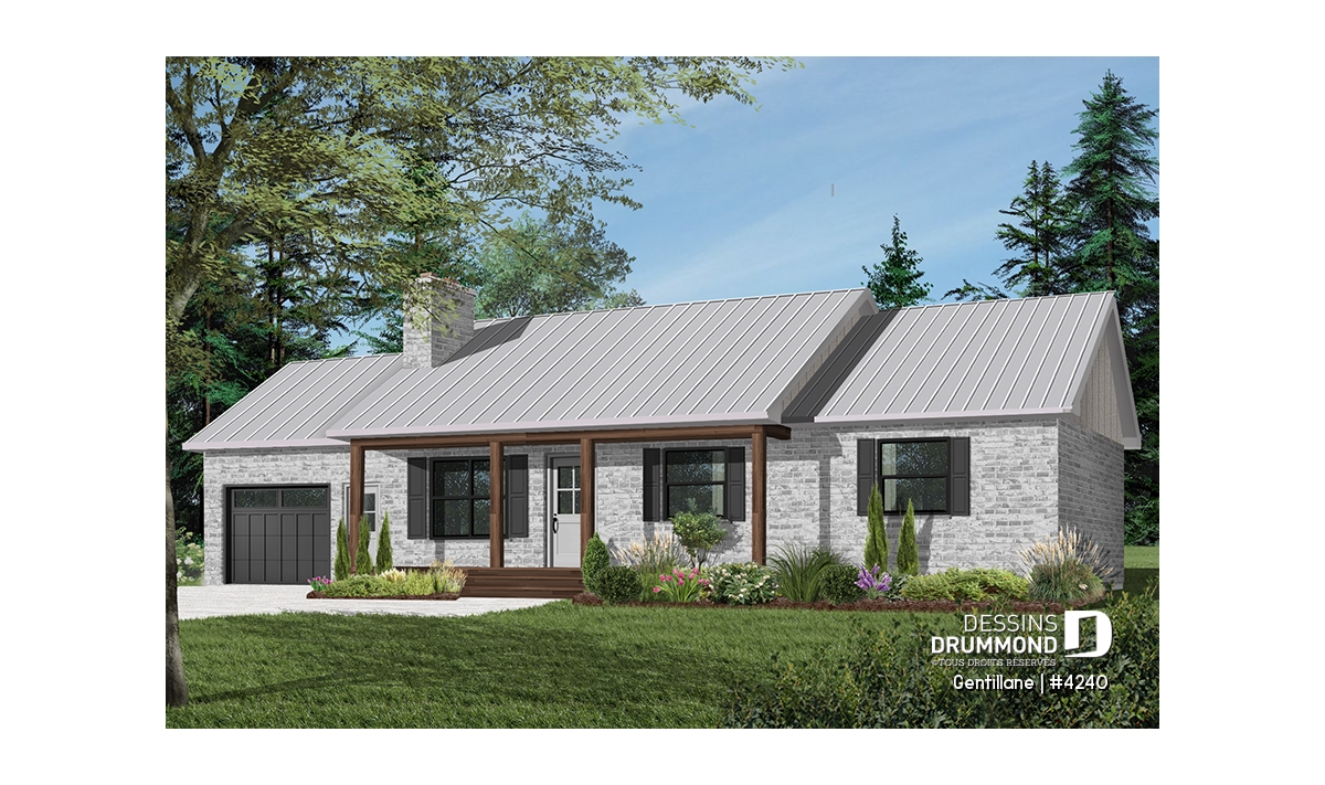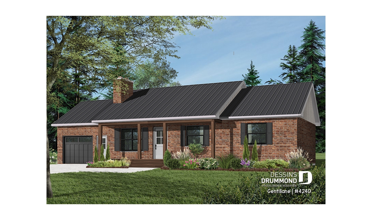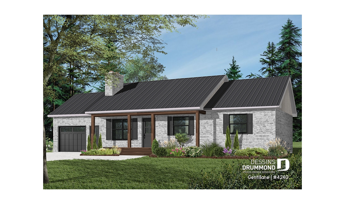 Vue avant - MODÈLE DE BASE - Bungalow américain, abordable, 3 chambres, garage, îlot-lunch, foyer, plancher à aire ouverte - Gentillane
