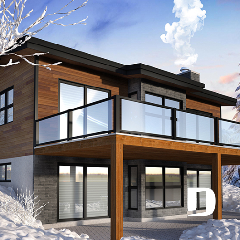 Plan de chalet 4-saisons de style contemporain avec sous-sol en rez-de-jardin.