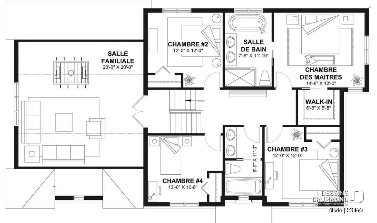 Sur le palier de l’escalier nous conduisant à l’étage, deux portes, de préférence vitrées, s’ouvrent sur un vaste espace salle familiale ( 20’ x 20’au-dessus du garage ) dans lequel plusieurs seront tentés d’aménager leur cinéma-maison et leur coin ordinateur ou, pourquoi pas, une superbe suite des maîtres permettant de convertir cette étage de 4 chambres en étage de 5 chambres.