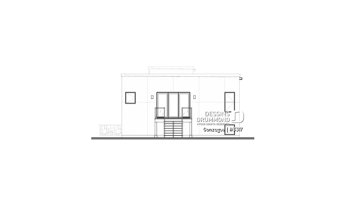 Ce magnifique plan de bungalow moderne suggère un extérieur plutôt épuré avec un heureux mariage de brique-pierre, d’enduit acrylique et de métal ainsi qu’un volume accentué à l’avant pour l’obtention d’une entrée principale remarquable avec ses 12 pieds de hauteur et tout en lumière grâce à une longue fenêtre latérale, toujours dans ce volume en brique-pierre, et par le biais de celles enveloppant la porte principale. Ici, les fenêtres en coin sont fréquentes et permettent un excellent apport en éclairage naturel.