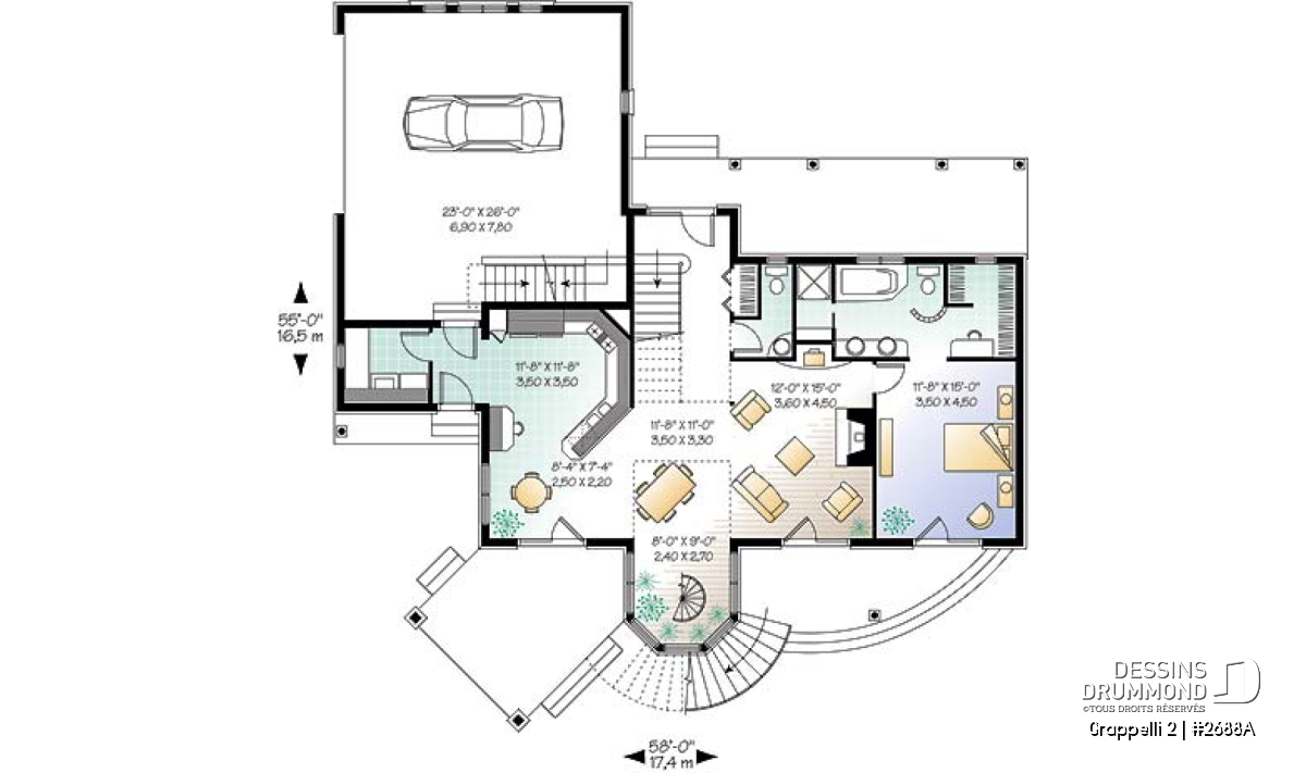 S’il est un plan qui a plu à nos voisins américains dès son arrivée sur le marché, c’est bien ce modèle 2688A pour lequel le concepteur a fait des pieds et des mains afin de rencontrer les requêtes émises par les dirigeants d’un concours américain. Ce concours visait à satisfaire les besoins de nombreux « boomers » en réalisant un plan de maison de format plus abordable et à l’intérieur de 2000 pi2 habitables excluant garage, espace boni et sous-sol. Une demande très très fréquente en ce moment aux États-Unis voire même de plus en plus au Canada.