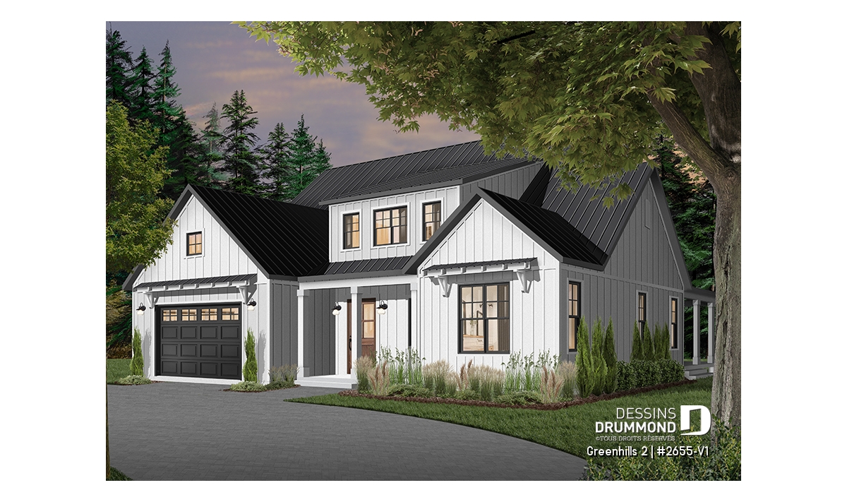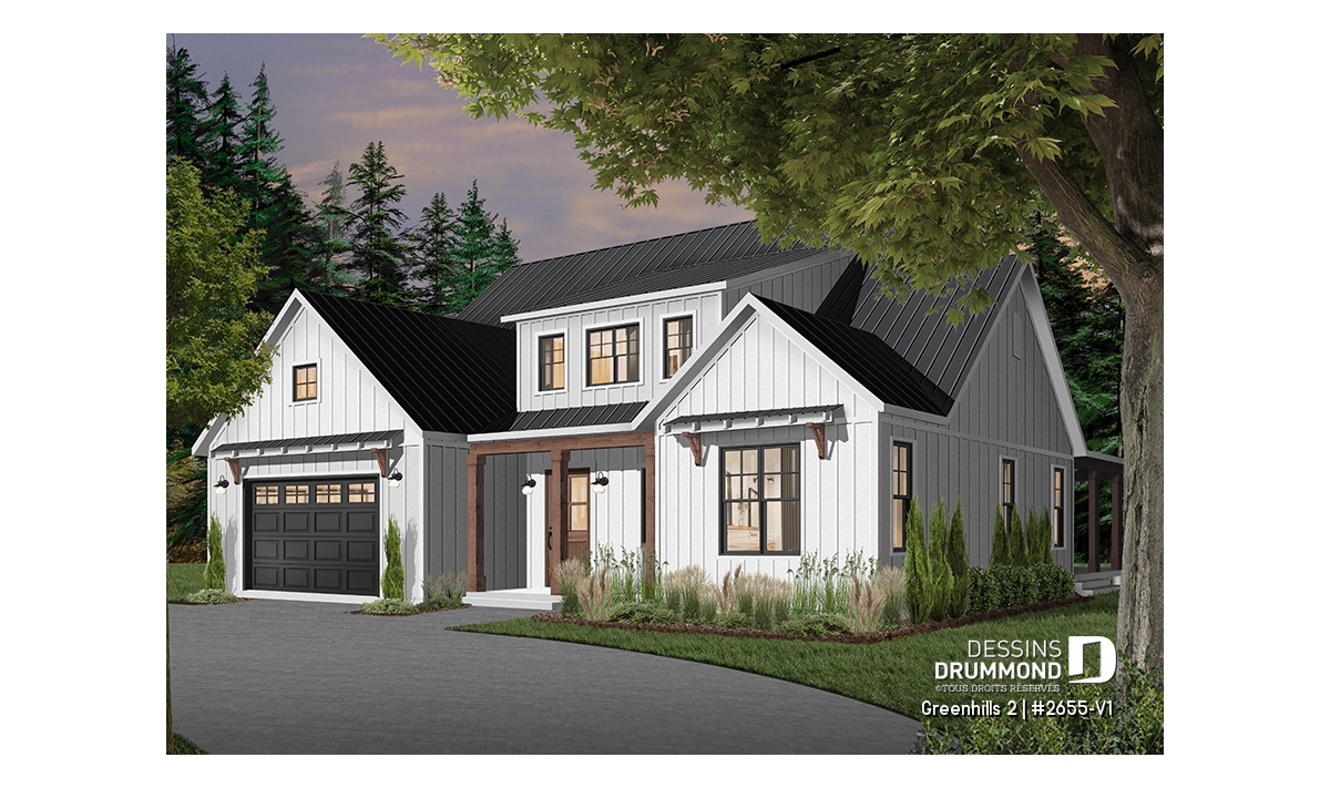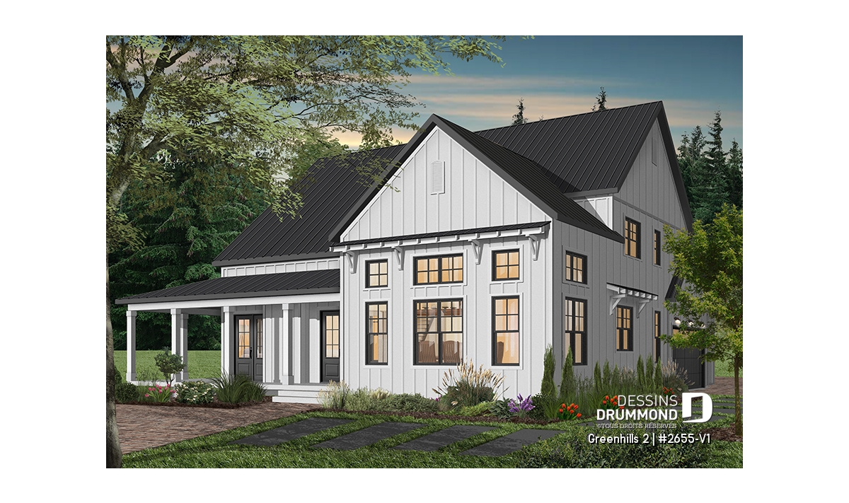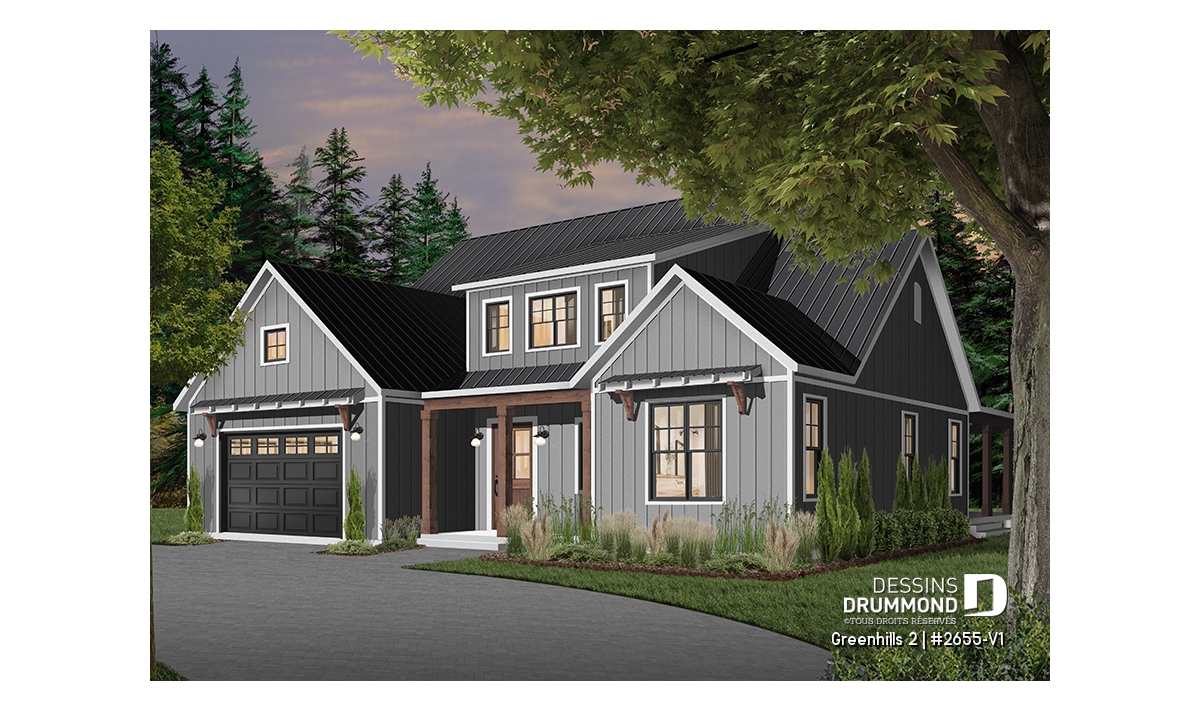 Plan de maison champêtre, aux accents modernes et américain.