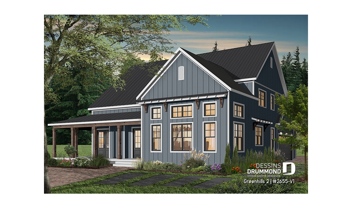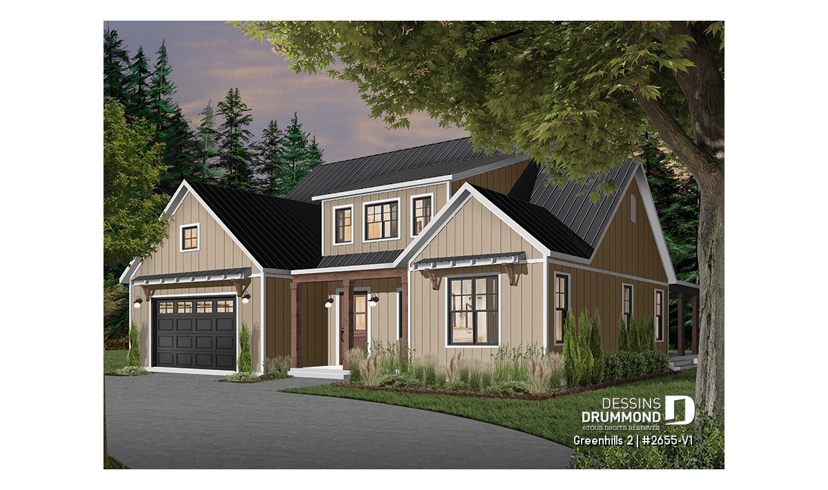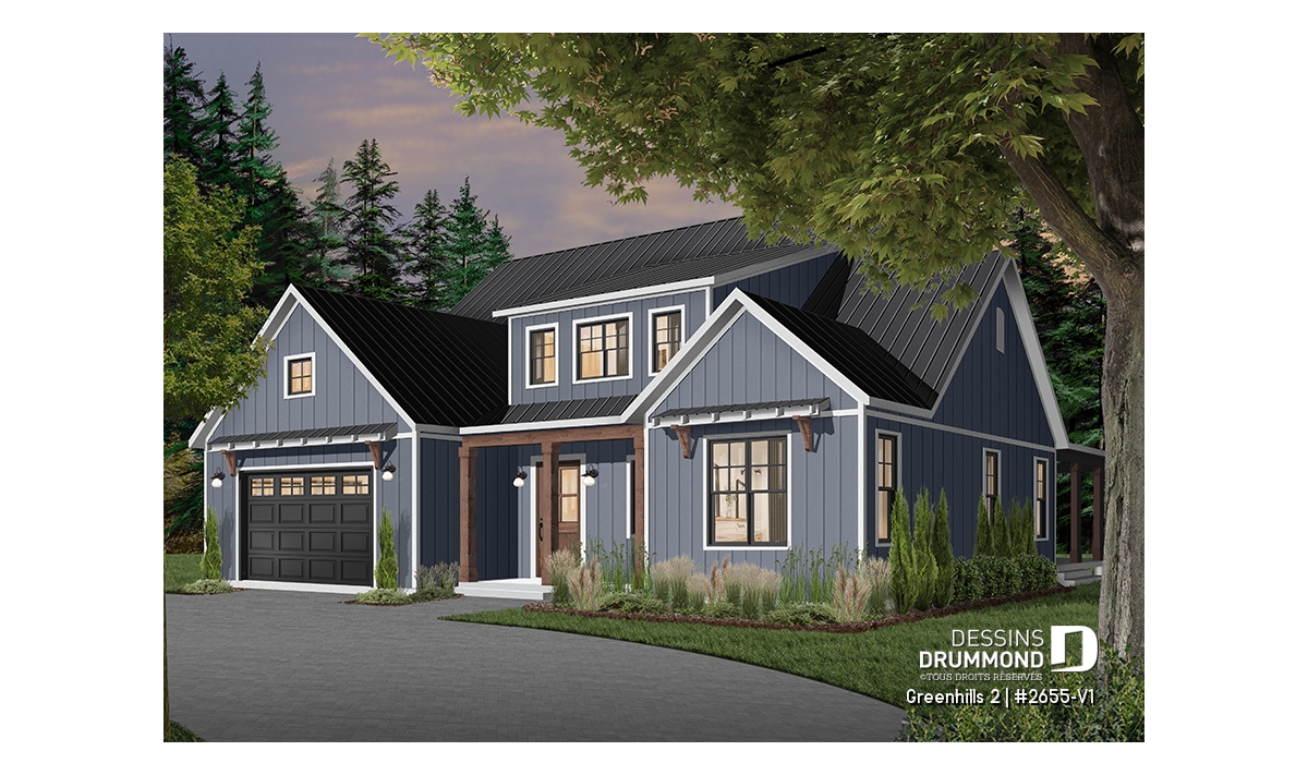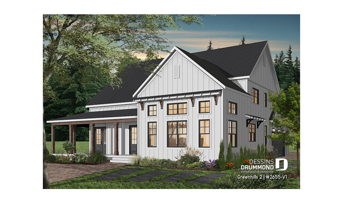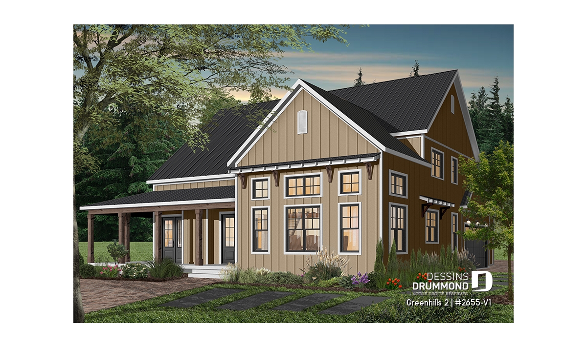 Plan de maison champêtre, aux accents modernes et américain.