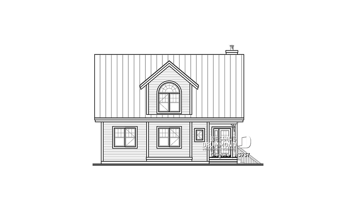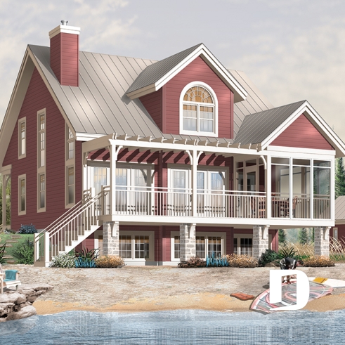 On ne peut passer sous silence cette superbe galerie arrière agrémentée d’une pergola, cet abri-moustiquaire combien apprécié en milieu panoramique et le garage double, avec rangement à l’étage, vendu séparément et que vous êtes en mesure de voir sur notre site dessinsdrummond.com sous le numéro 2987 dans les plans de garages.