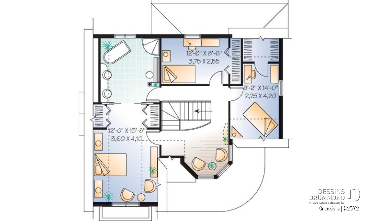 À l’étage, trois chambres, une salle de bain, avec bain sur pattes, et un espace boudoir dans la tourelle occupe ce plancher. Des portes coulissantes sont aménagées entre la la chambre no1 et la salle de bain pour en faciliter l’accès et créer une certaine intimité. Avis aux intéressés : une version réaménagée avec garage double avec un espace boni important sera disponible sous peu.