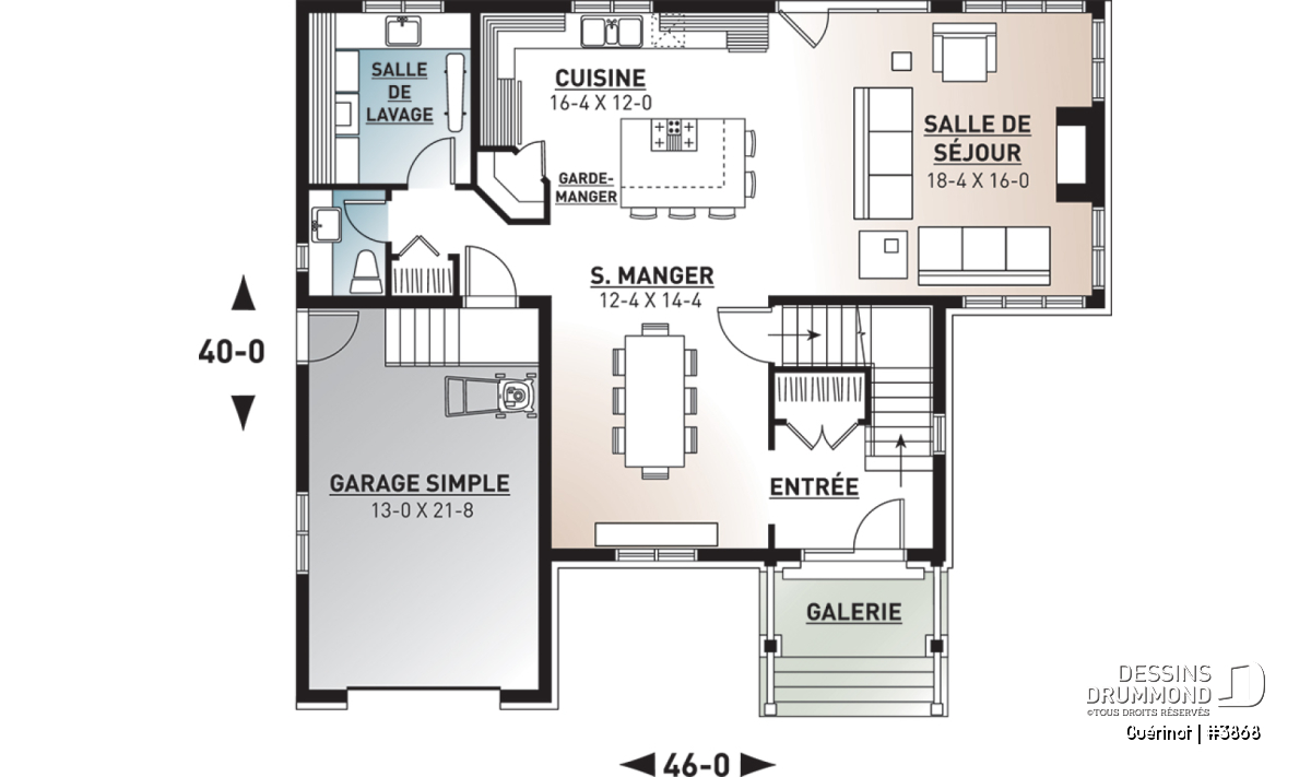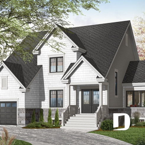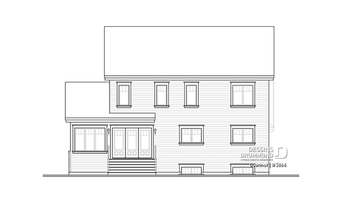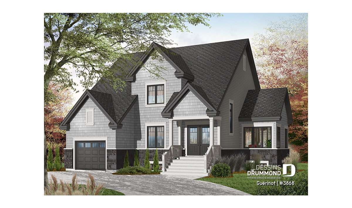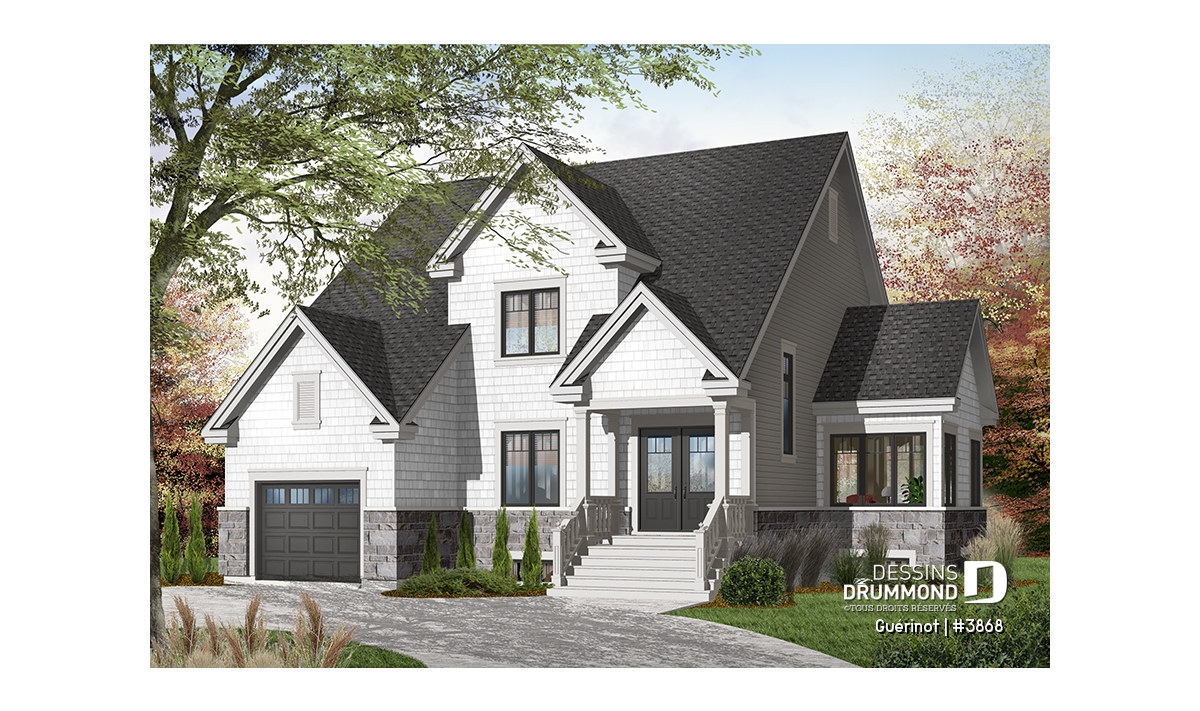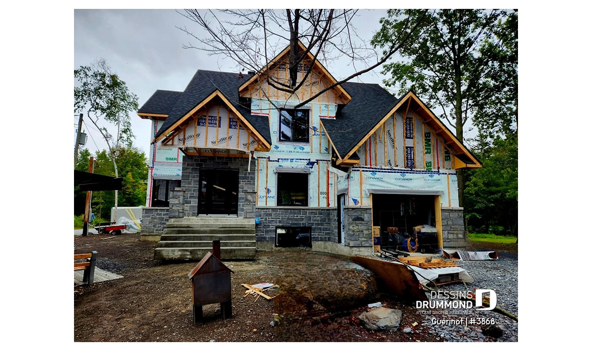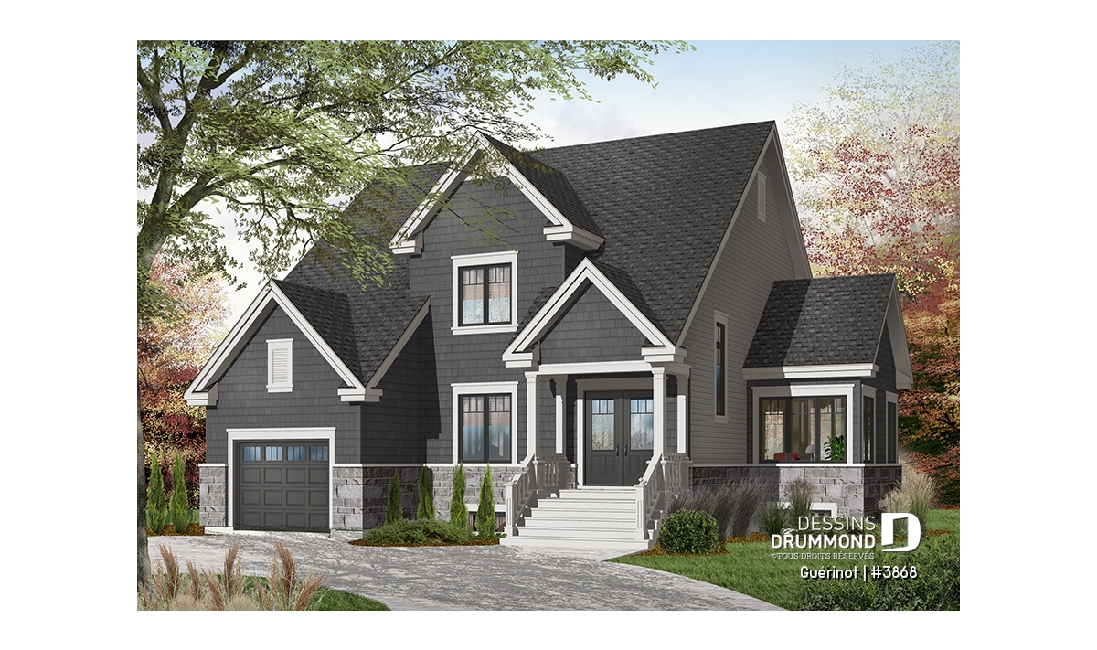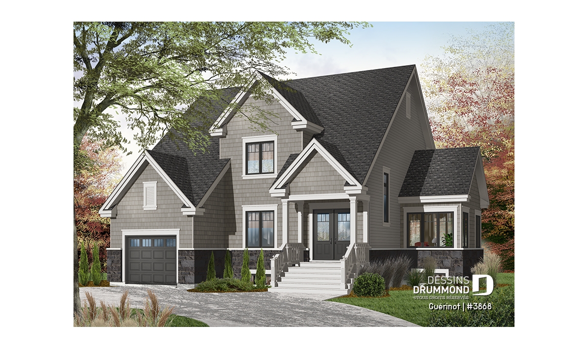 Pensé d’abord pour être d’un certain confort intérieur, ce plan # 3868 de Dessins Drummond, aussi appelé Guérinot, se veut à la fois remarquable par son extérieur peu commun et caractérisé par quelques emprunts au style Cape Cod et Craftsman, dont cette brique-pierre et cette imitation bardeau de cèdre que l’on peut apprécier en façade principale.