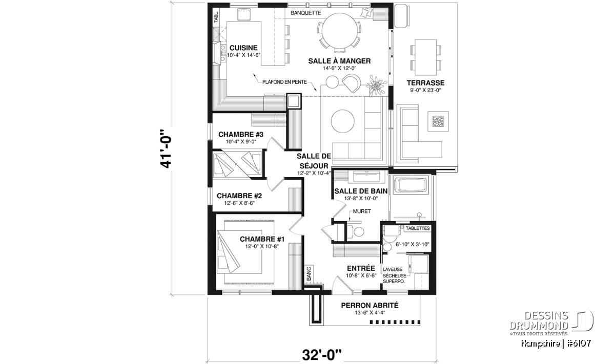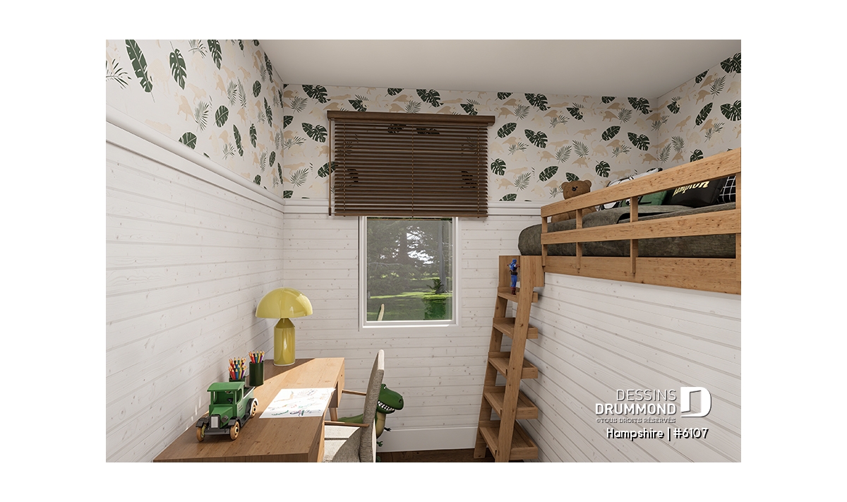 Plafond à 9' aux secteurs chambres et salle de bain, et plafond en pente à l'arrière de la maison.