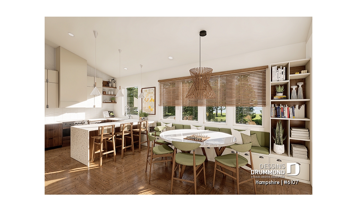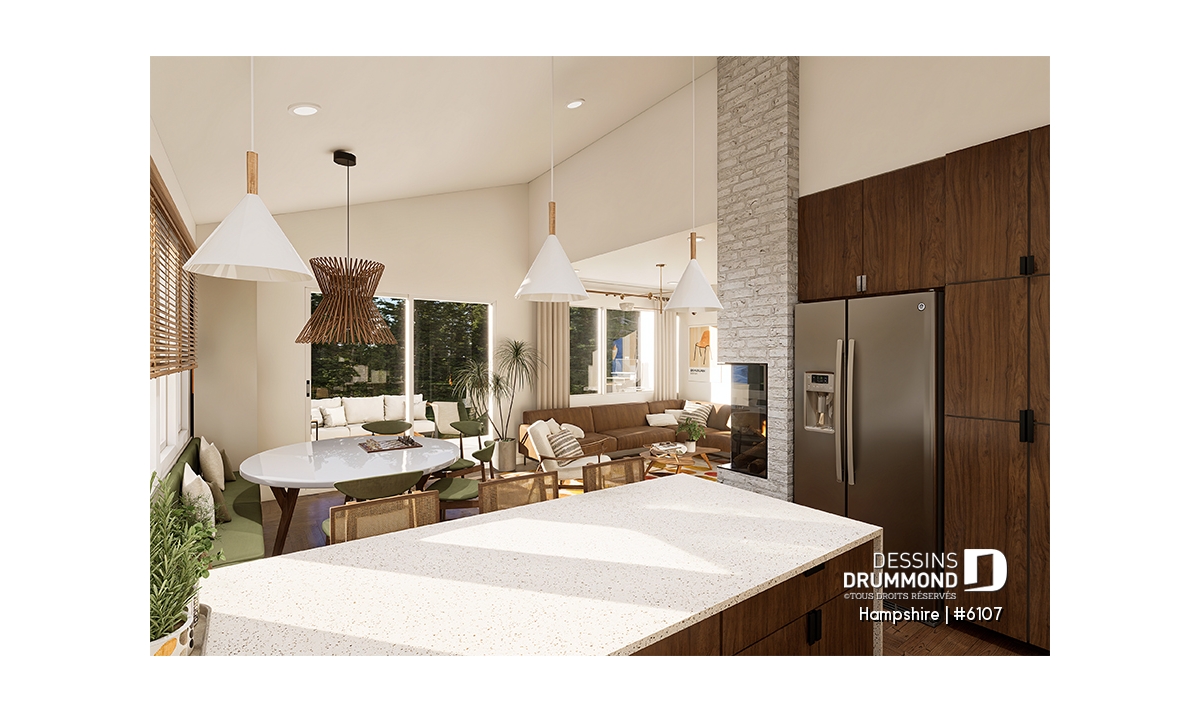Plafond en pente, Banquette, Bain dans la douche, Plafond à plus de 8', Tablettes, Meuble(s) encastré(s), Comptoir-lunch, Aire ouverte, Foyer, Bain dans la douche