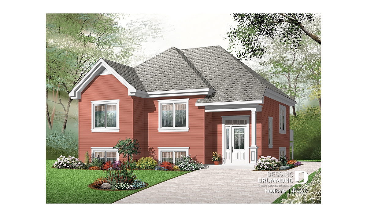 Plan de plain-pied budgétaire à entrée split, 2 chambres, îlot à la cuisine, belle lumière au sous-sol