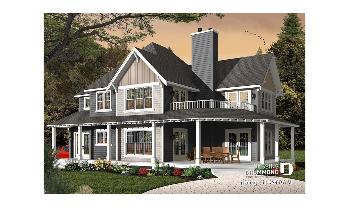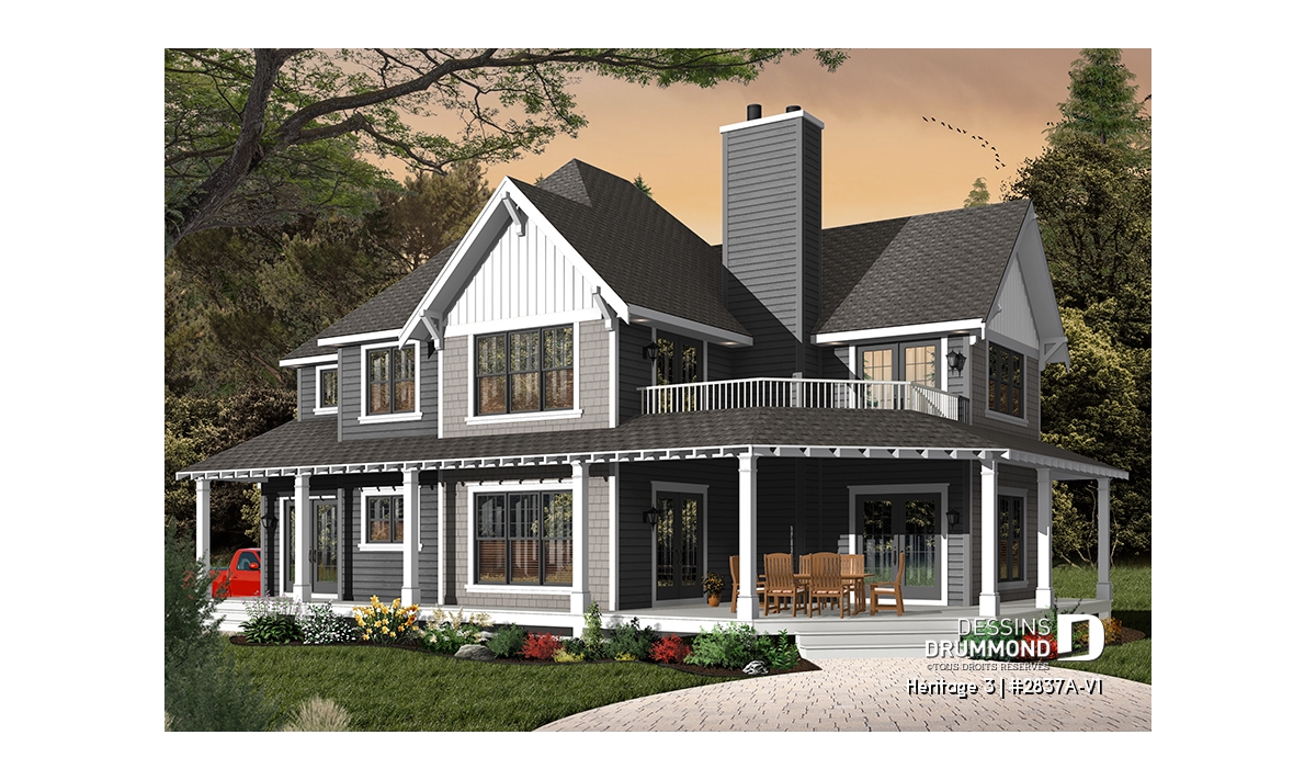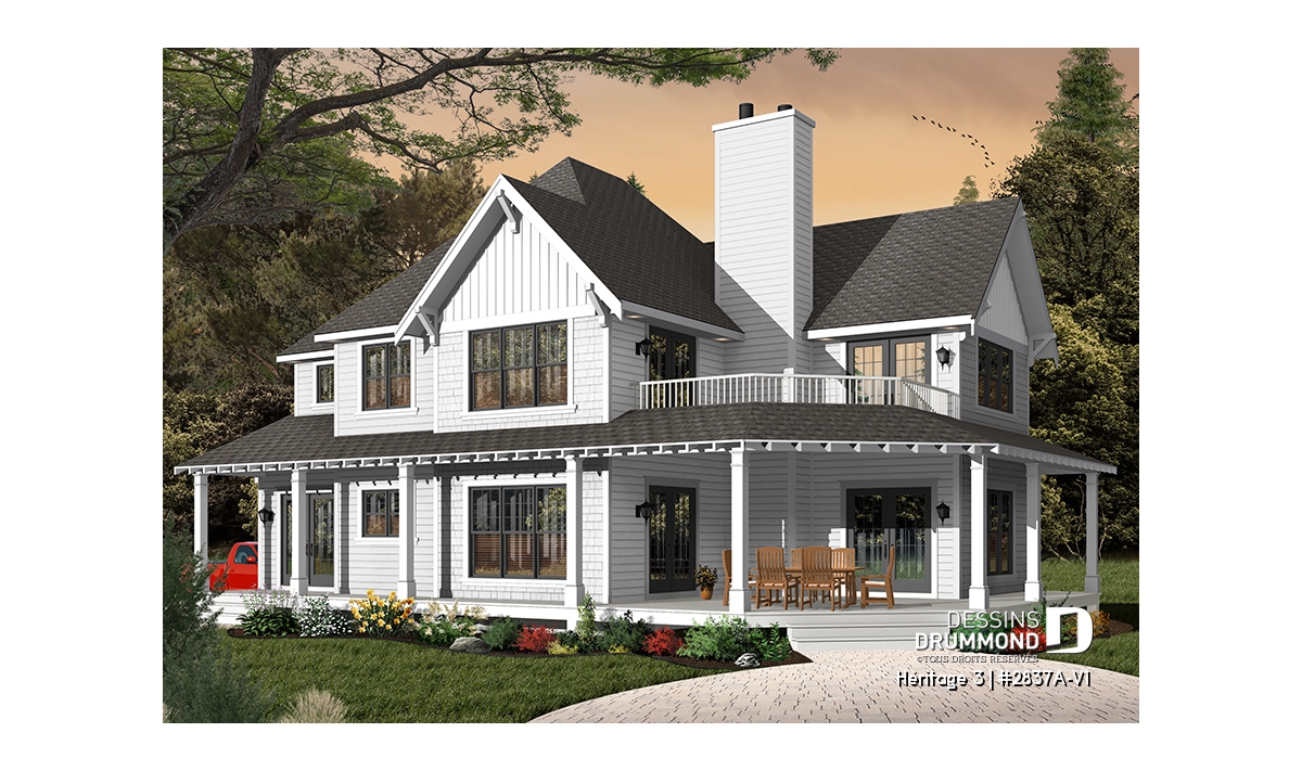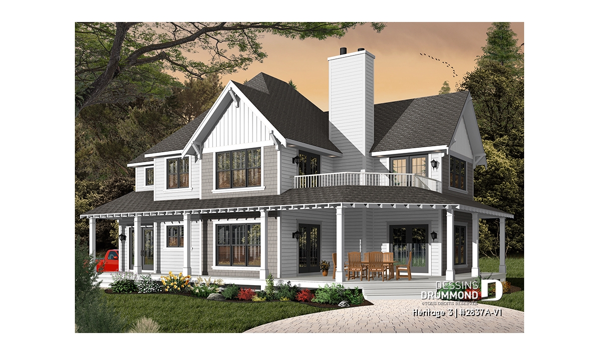 Vue avant - MODÈLE DE BASE - Plan maison champêtre, 3 chambres, garage double, 2 salons, foyer, plusieurs terrasses - Héritage 3