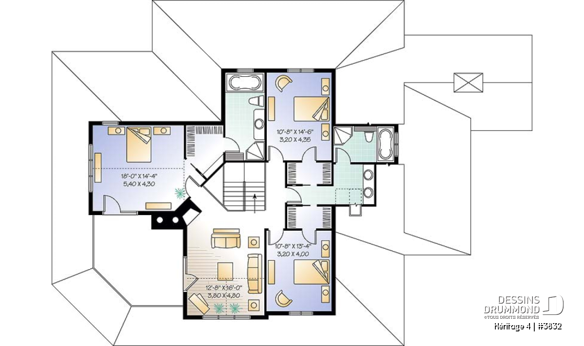 À l’étage, on retrouve, à quelques détails près, le même aménagement que pour le modèle 2837, dont celui-ci origine, alors que la suite des maîtres devient ici la suite d’invités et avec tout le confort que cela comporte comme une salle de bain privée par exemple. On remarque aussi deux belles chambres secondaires avec accès à une salle de bain commune et bien organisée avec une séparation de l’espace vanité du regroupement de la douche, de la toilette et du bain. Sans oublier, cette magnifique salle de séjour avec foyer et accès à la terrasse de l’étage pour encore plus de confort et pour la possibilité d’aménager une 5è chambre.