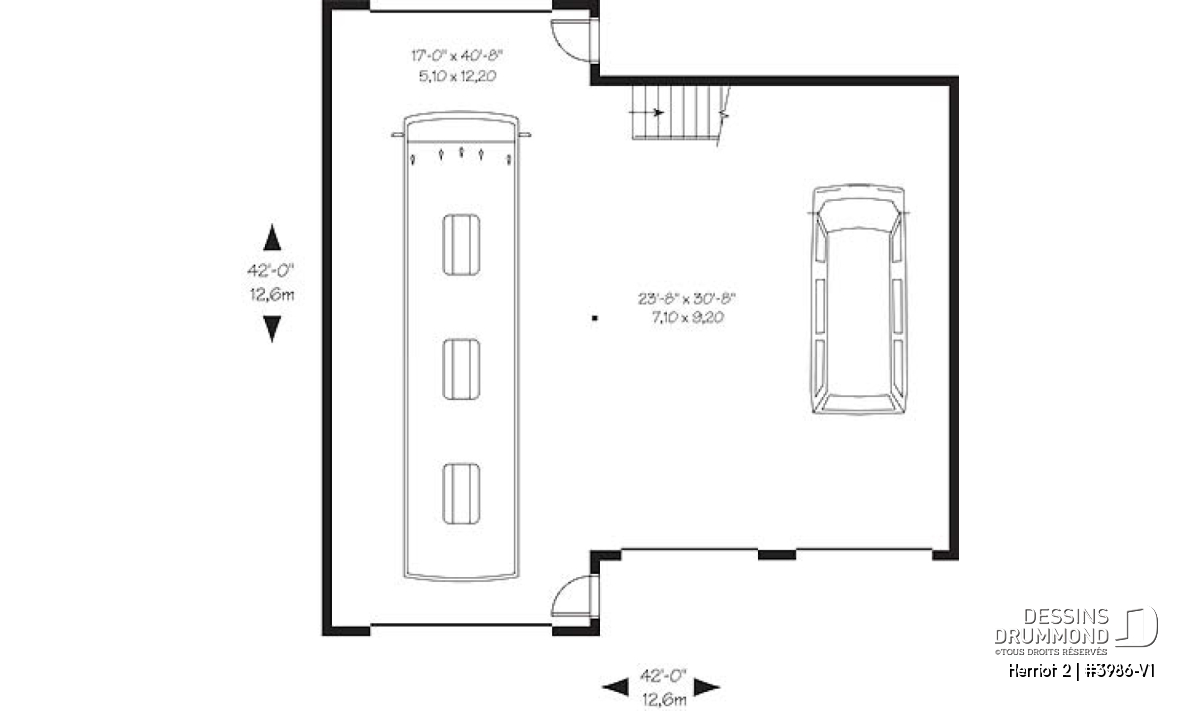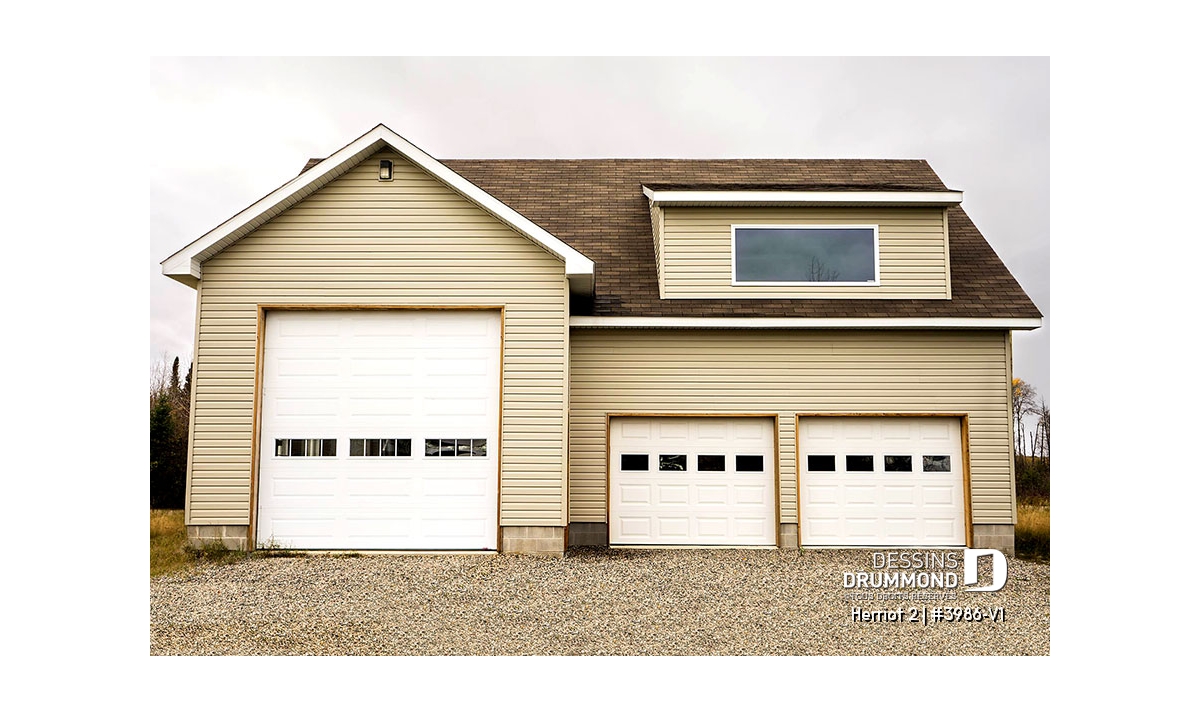 Plan de garage triple pour voitures et VR véhicule récréatif, avec espace boni à l'étage