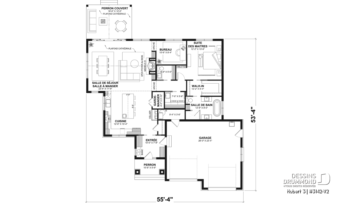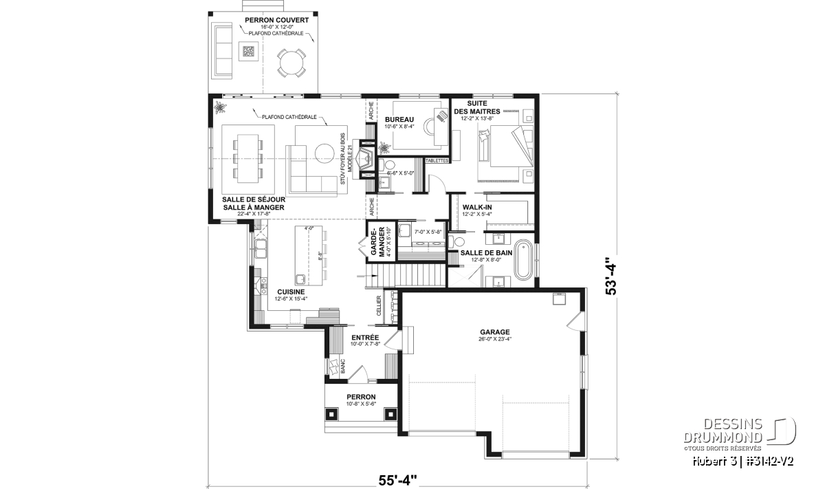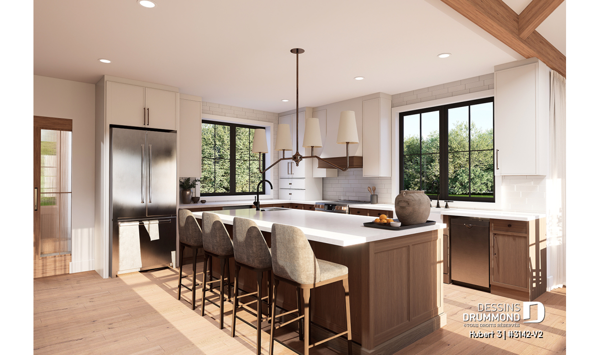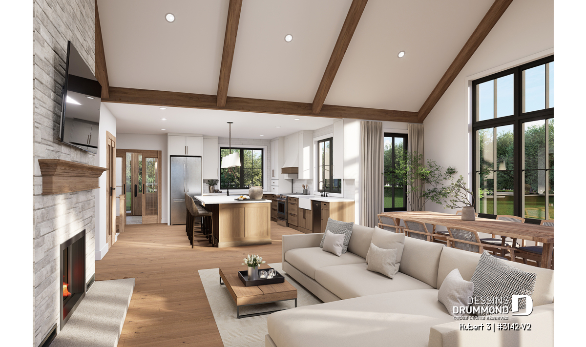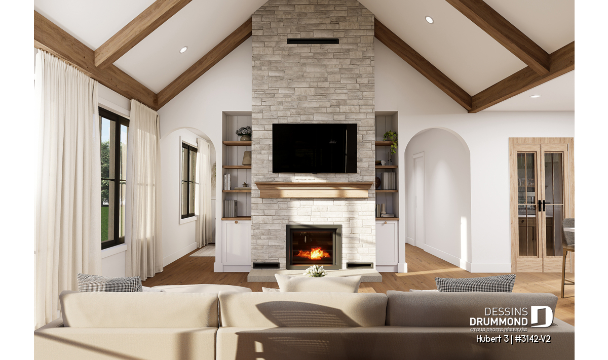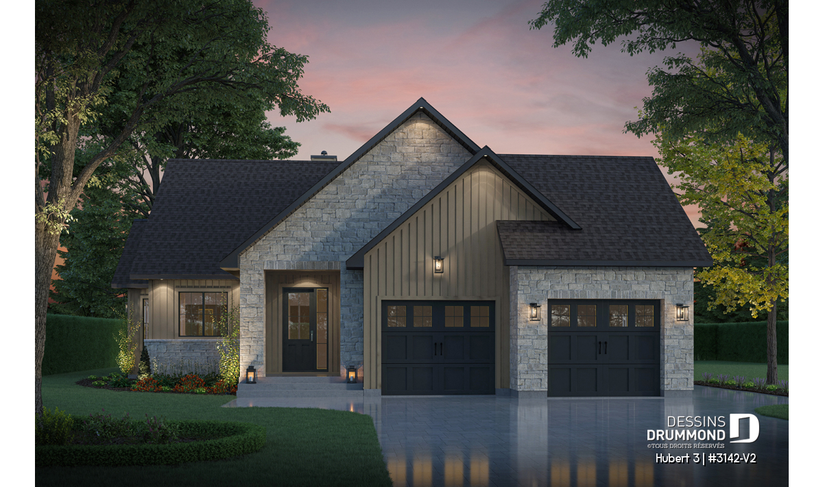 Le plan HUBERT 3 (#3142-V2) incarne une vision raffinée et chaleureuse de la maison de plain-pied moderne. Pensé pour répondre aux besoins actuels des familles, ce modèle se distingue par son équilibre entre fonctionnalité, esthétique et qualité de vie. Faisant partie de la Collection de plans de maison avec foyer STÛV, reconnue pour ses foyers au design remarquable, HUBERT 3 offre un cadre de vie aussi accueillant que durable.