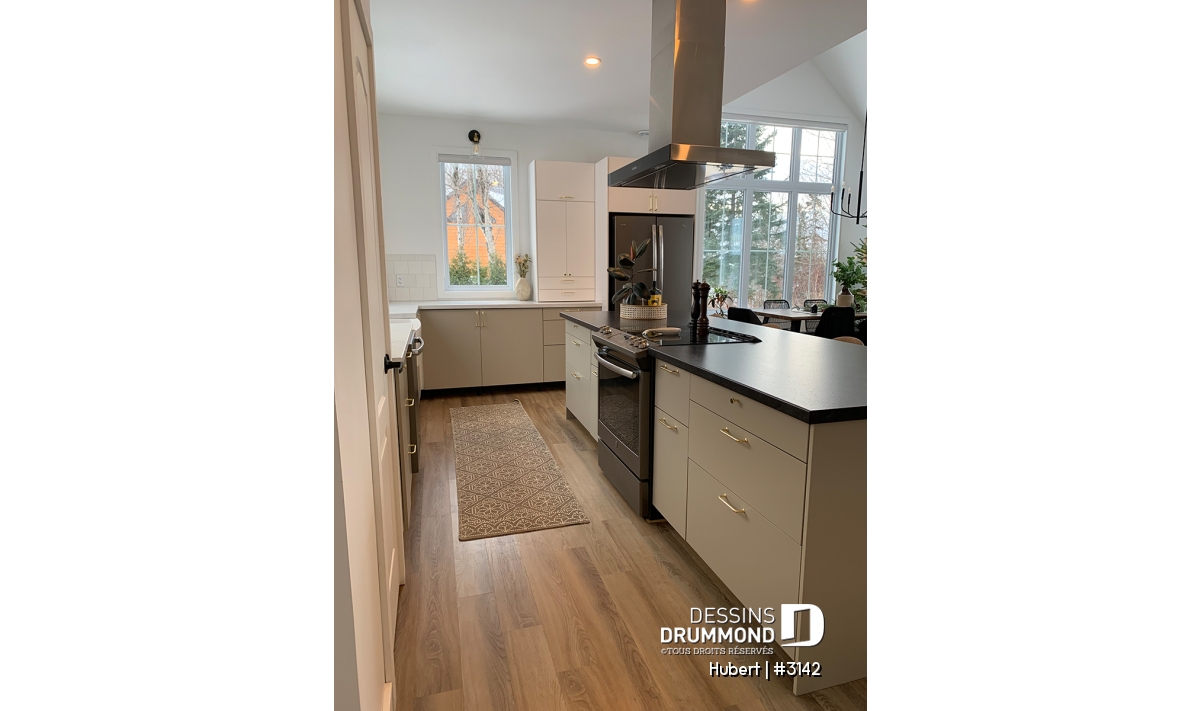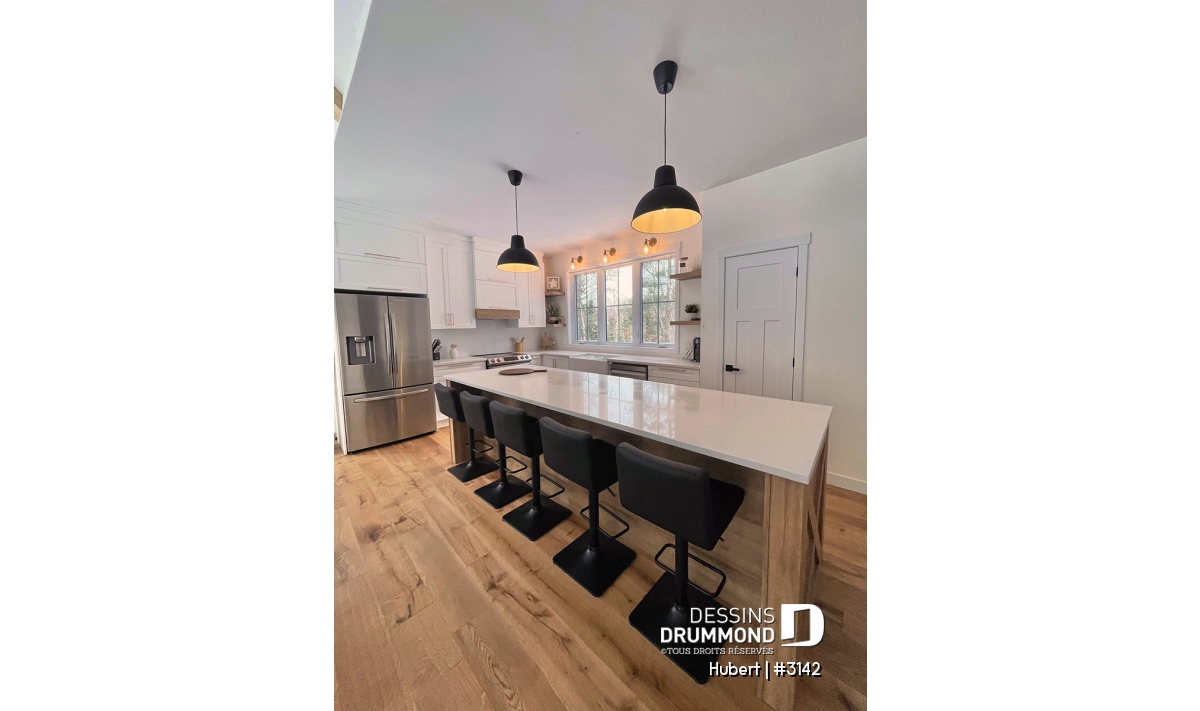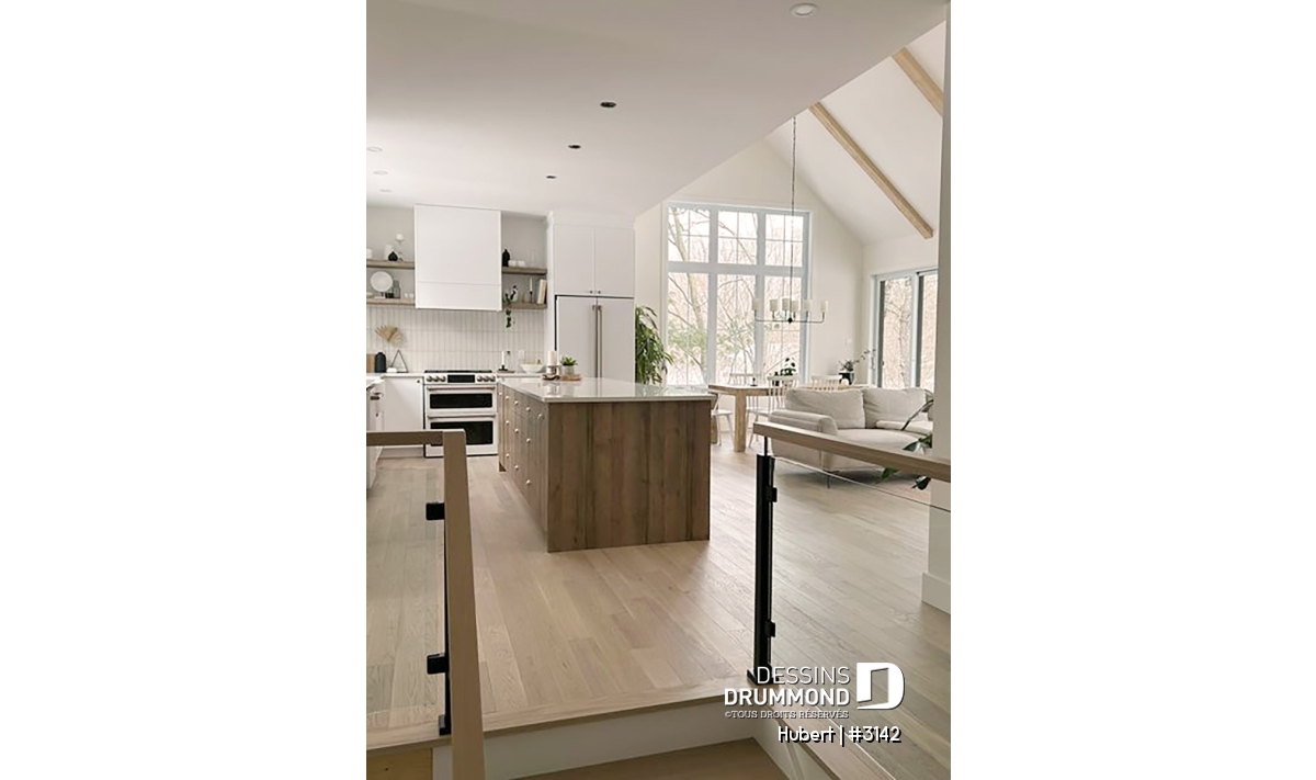 Le cœur de la maison se compose d’une aire ouverte lumineuse regroupant la cuisine, la salle à manger et le salon. Cette disposition favorise la convivialité et les échanges au quotidien. La cuisine se distingue par son grand îlot central et son garde-manger pratique, parfaits pour cuisiner, recevoir et partager de bons repas en famille.