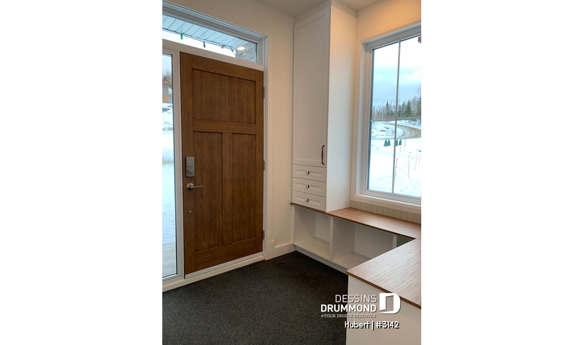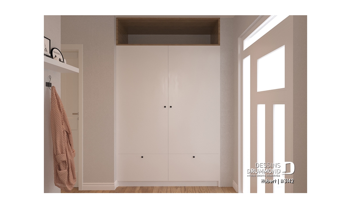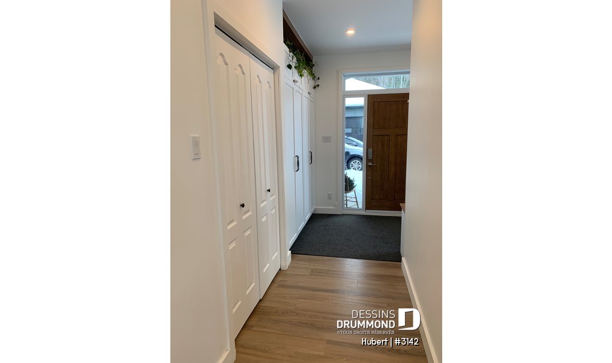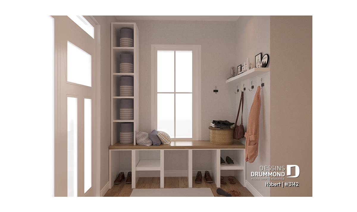 Entrée fonctionnelle avec banc intégré et deux garde-robes pratiques.