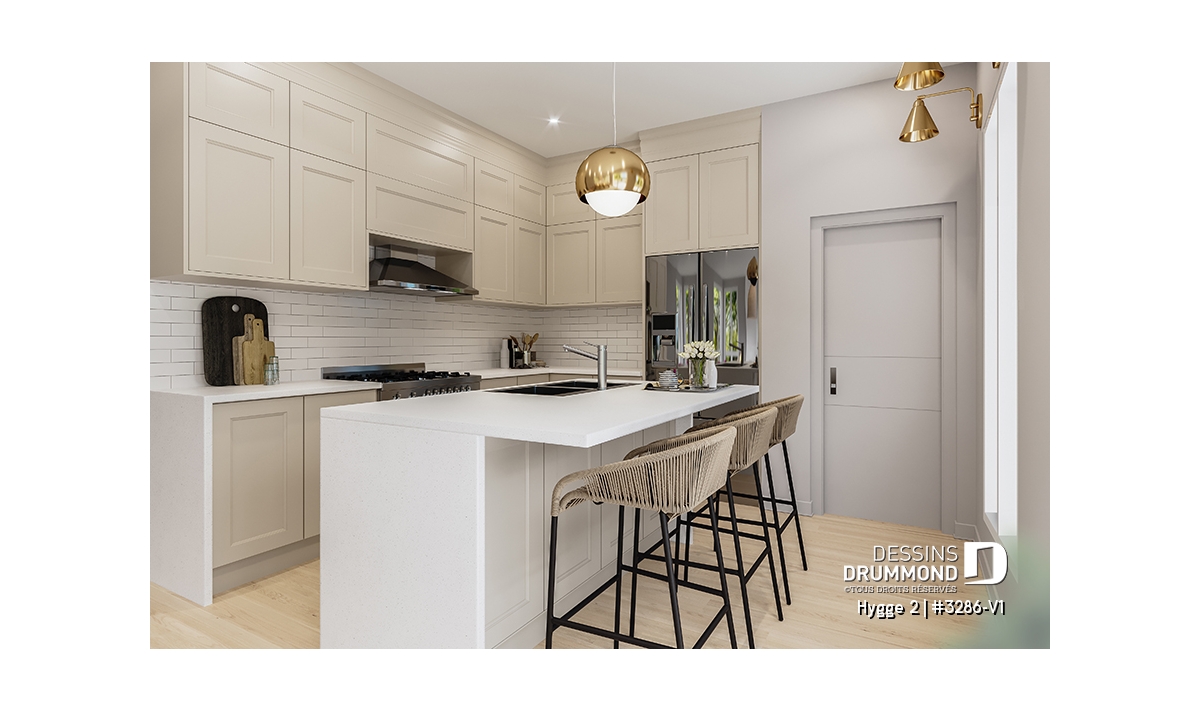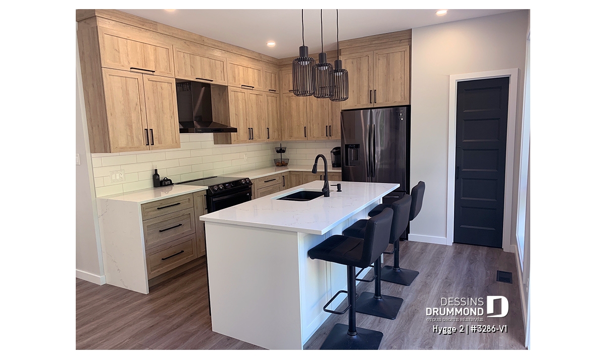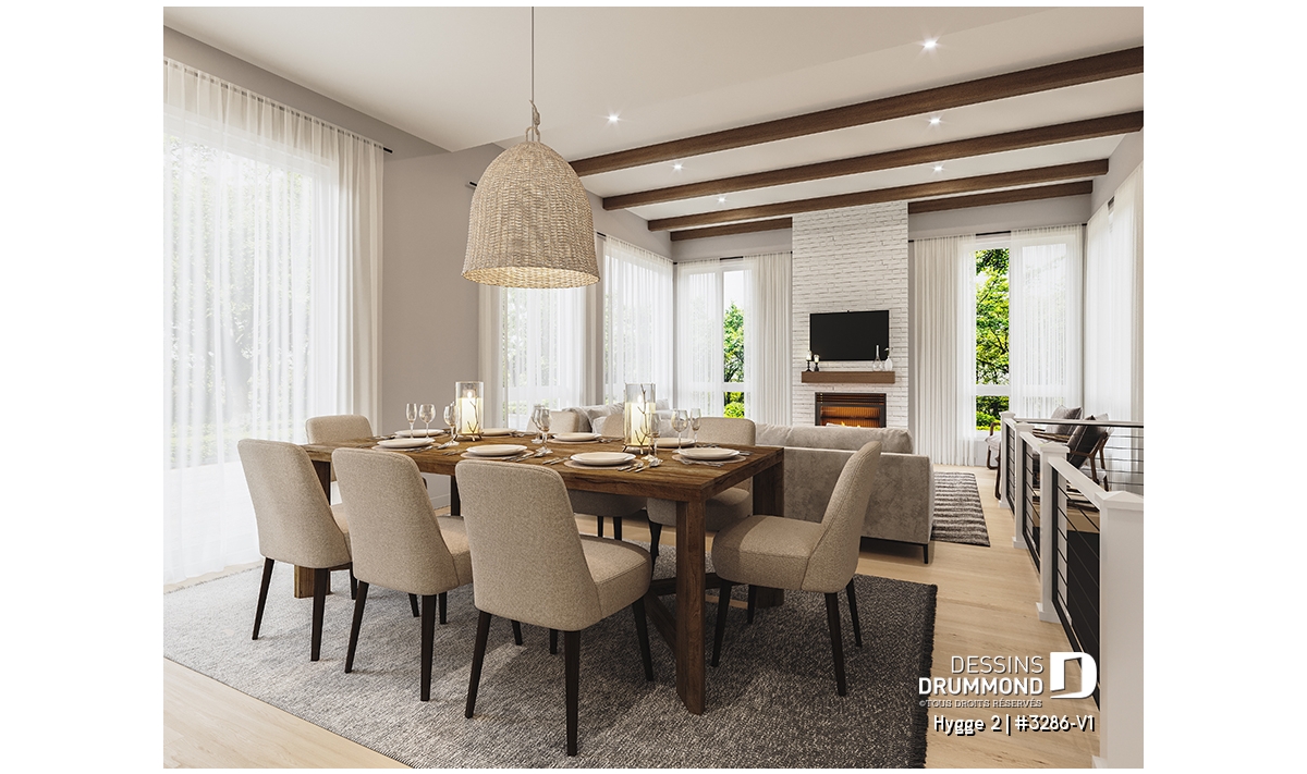 Le cœur de la maison se trouve dans l’aire ouverte arrière, entièrement baignée d’une magnifique lumière naturelle. La cuisine, dotée d’un grand îlot central et d’un garde-manger généreux, s’ouvre sur la salle à dîner afin de favoriser l’atmosphère conviviale typique des maisons scandinaves. Le salon adjacent, avec son foyer chaleureux et son plafond de 10', complète parfaitement cet espace de vie où il fait bon se retrouver.