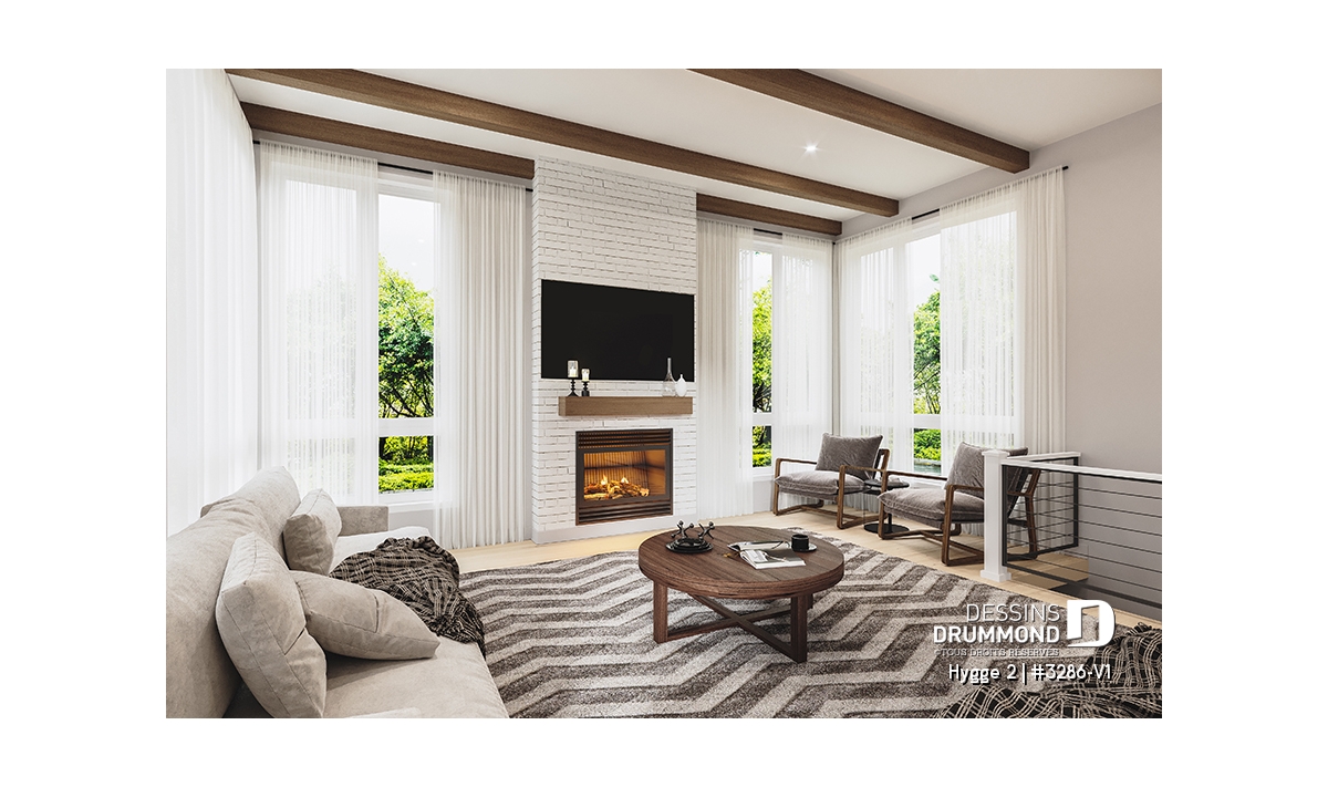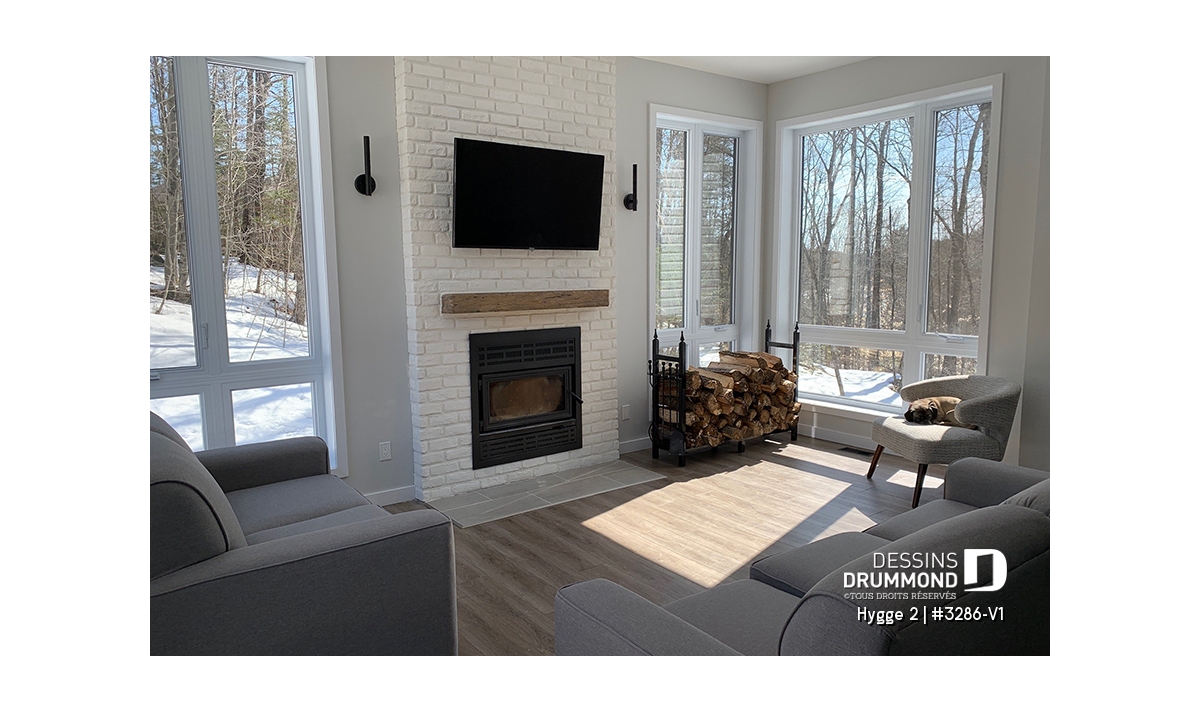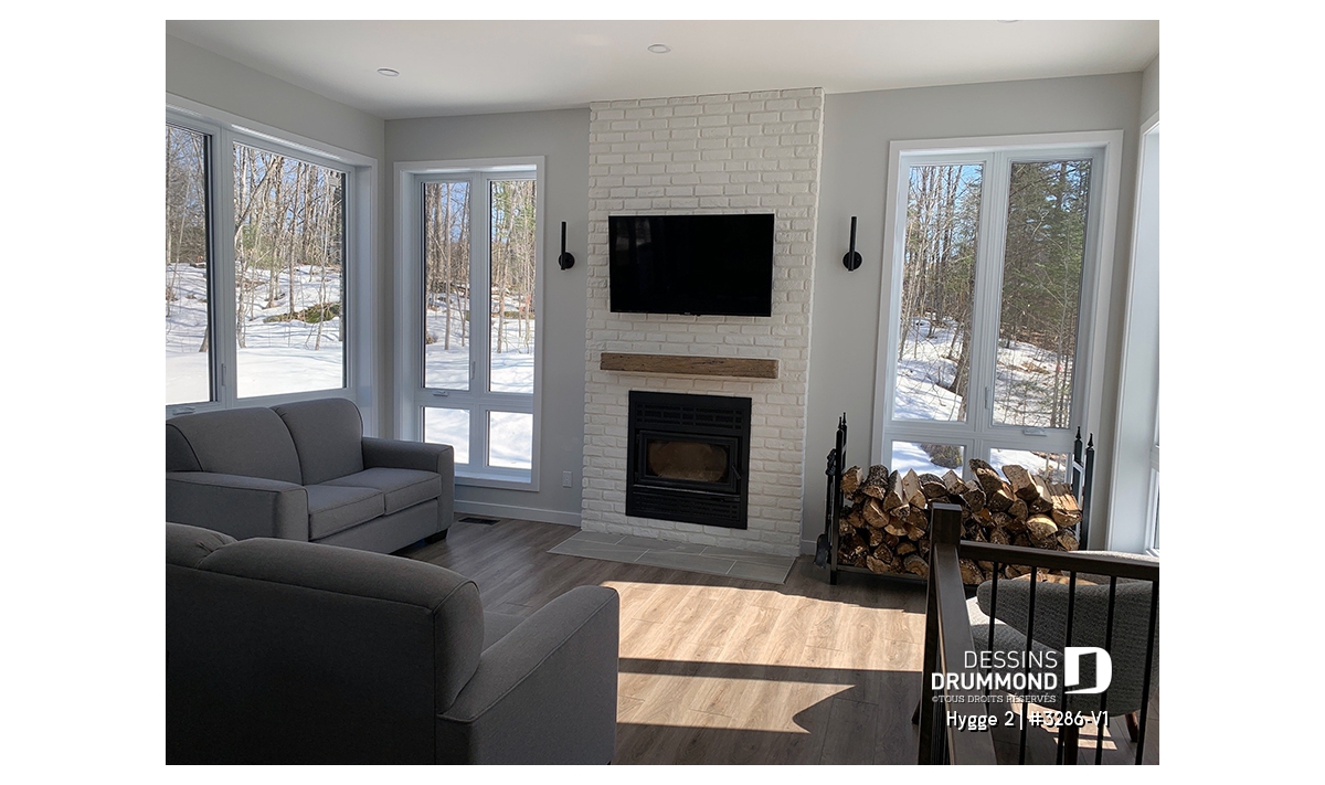 Salon doté d’un foyer chaleureux et d’un plafond de 10', tandis que le reste de la maison bénéficie d’un plafond de 9'.