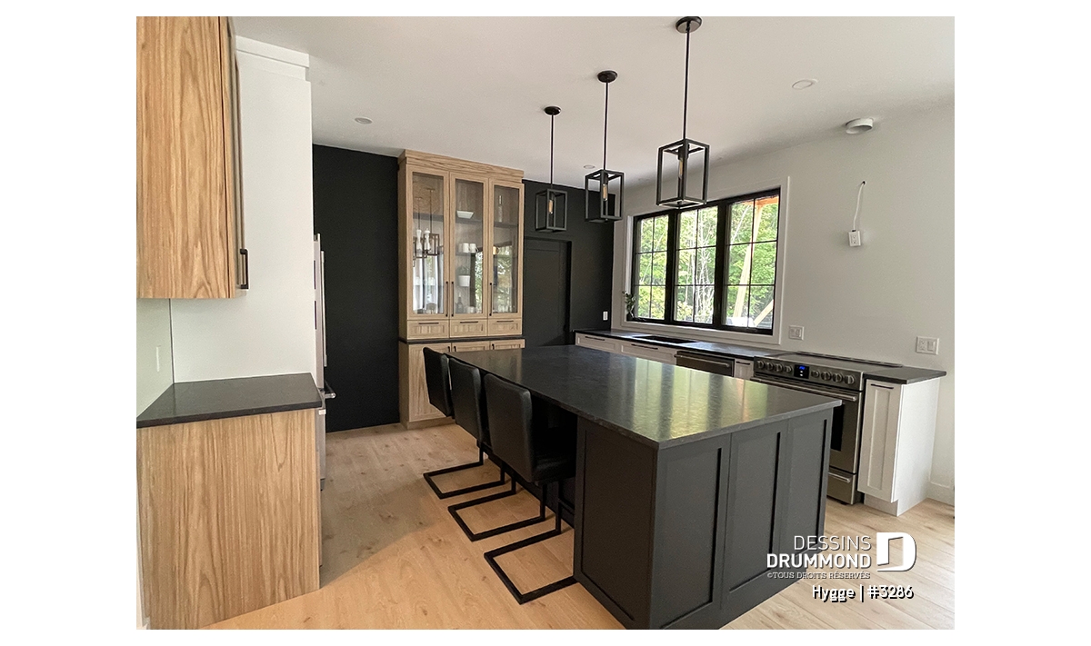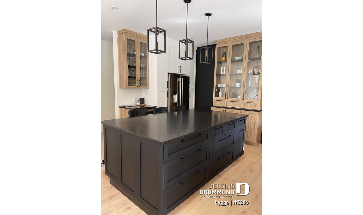 Cuisine fonctionnelle avec grand garde-manger et îlot central, ouverte sur la salle à manger et le salon.