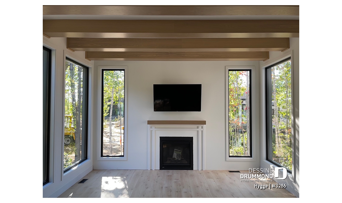 Salon chaleureux avec foyer et magnifique lumière naturelle.