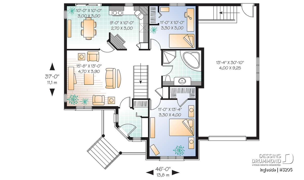 À l’intérieur, un vestibule bien éclairé suggère un banc intégré ainsi qu’un vestiaire original. L’accès à la salle de séjour est tout aussi heureux car on y constate un espace suffisamment éclairé et particulièrement confortable. La salle à manger est suggérée fermée de la salle de séjour mais pourrait bien être ouverte, si les propriétaires le désiraient, étant donné que la cloison les séparant n’est absolument pas indispensable. La cuisine, avec réfrigérateur à angle, propose une organisation fonctionnelle et des éviers en coin.