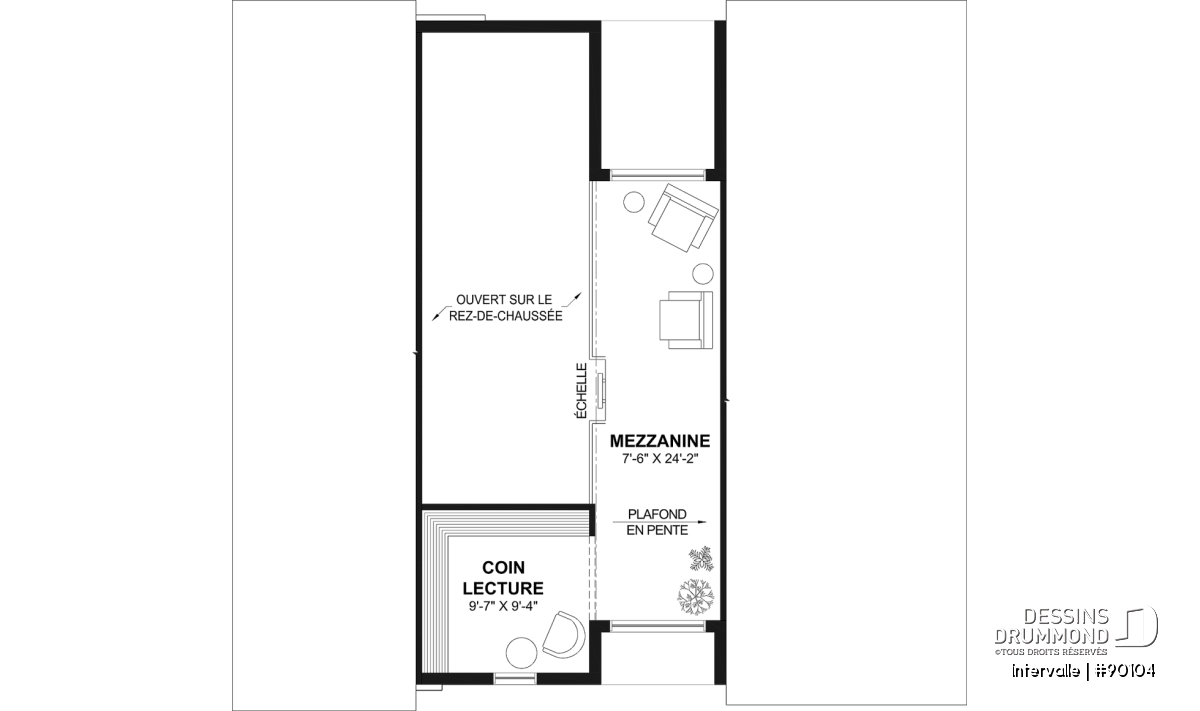 Plafond de 8' en pente à la mezzanine et de 5'6'' au coin lecture.