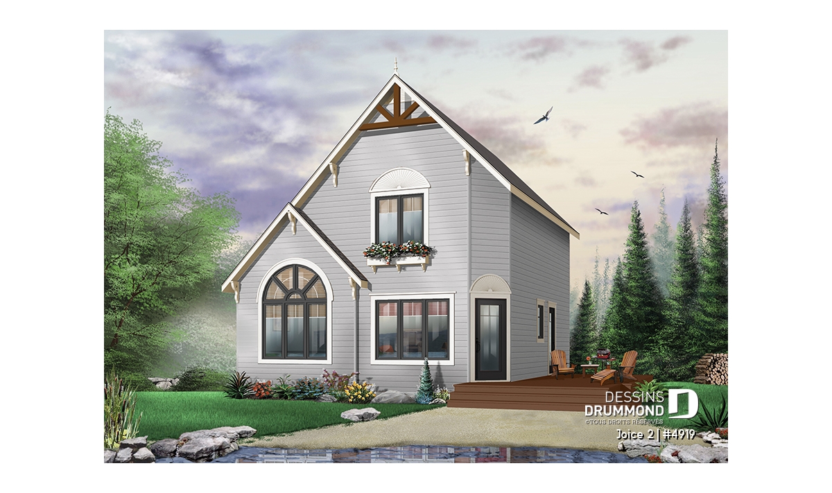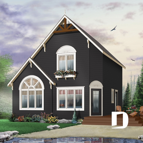 Plan de maison ou chalet champêtre, 2 ou 3 chambres, cathédrale et mezzanine, superbe fenestration