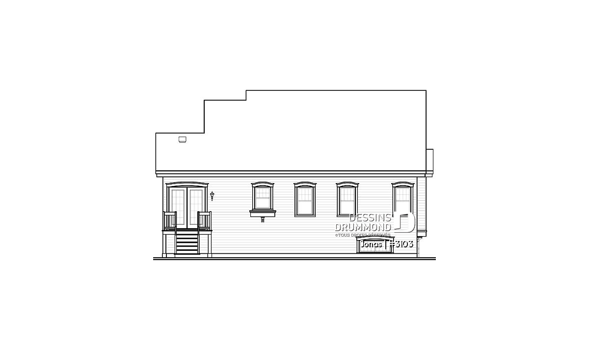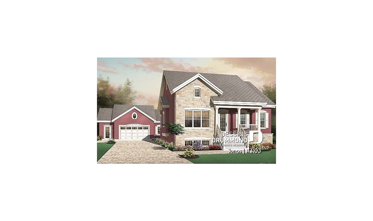 Toujours dans cette lignée de nouveaux plain-pied, Dessins Drummond vous propose ici deux versions intérieures pour un extérieur quasiment semblable et passablement distinct. L’usage de brique-pierre à la base de celui-ci et sur un mur-pignon, en façade, combiné à un déclin champêtre et un escalier fort invitant, confère à ce modèle un cachet plutôt unique. Fait à noter ici : avec la façon dont DDI réalise ses plans, il est facile de prolonger le parement léger extérieur ( en l’occurrence ce déclin bourgogne ) sans complication et par dessus la fondation, pour amplifier la maison, la rendre davantage esthétique et éviter l’application d’agrégat.